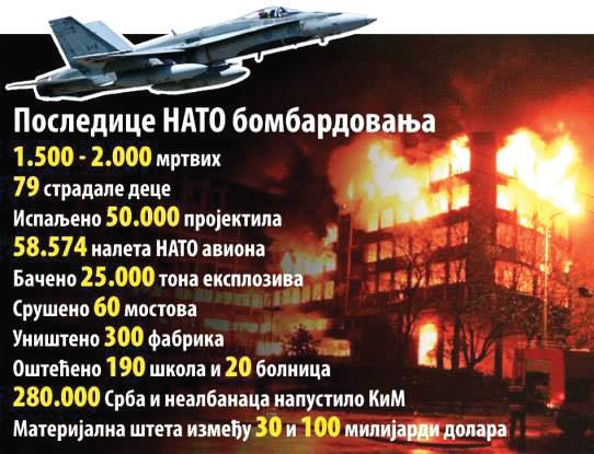 Agresija NATO-a na Srbiju, odnosno tada{wu SR Jugoslaviju po~ela je pre 27 godina, 24. marta 1999. godine u 19.53 ~asova. Agresija na SRJ bila je presedan i izvedena je bez saglasnosti Saveta bezbednosti UN. Prema podacima Ministarstva odbrane Srbije, tokom NATO agresije ubijen je 1.031 pripadnik vojske i policije, a rawena su 5.173 vojnika i policajca. Poginulo je oko 2.500 civila, me|u wima 89 dece, a raweno je oko 6.000 civila, od toga 2.700 dece.