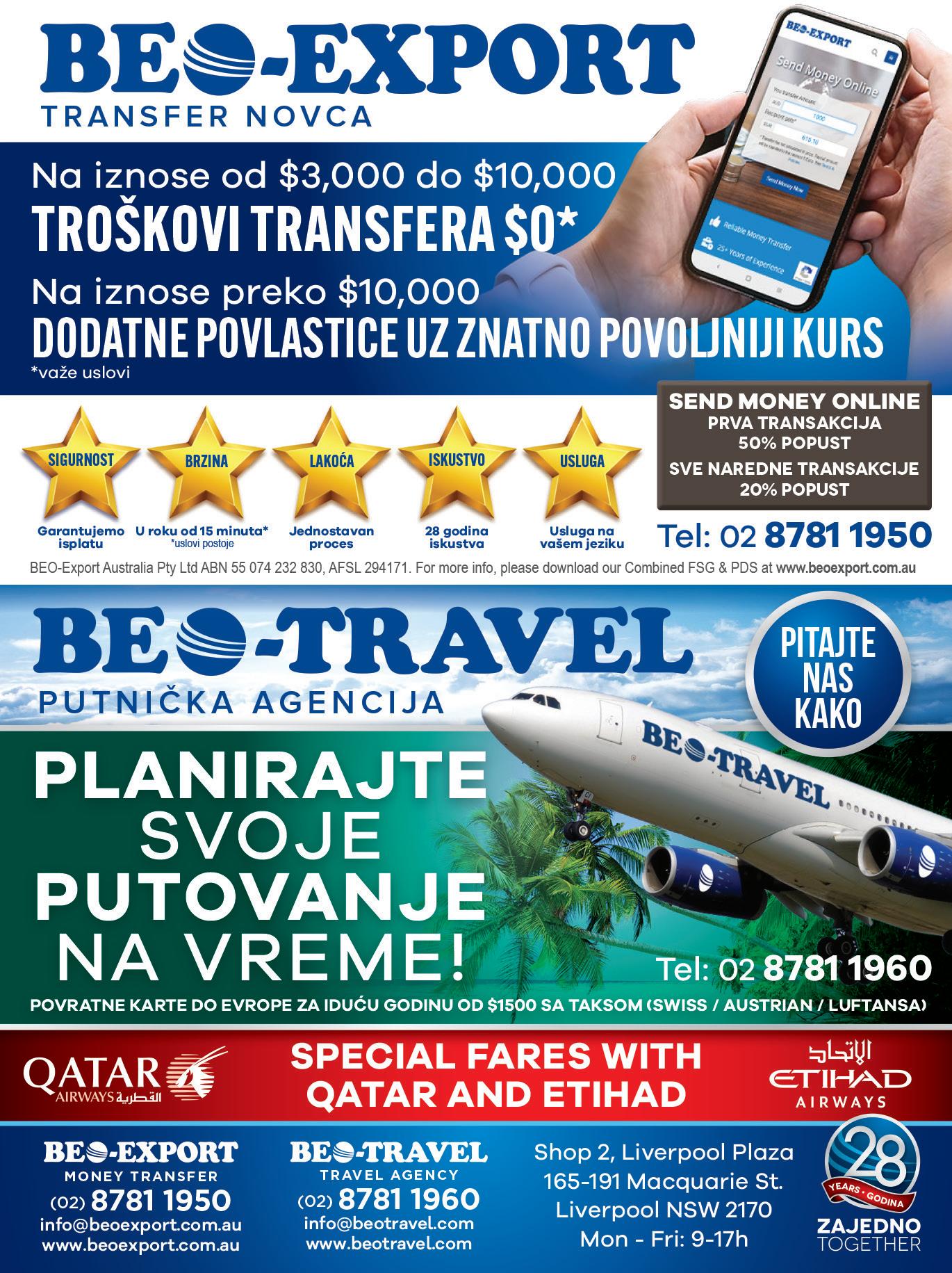2 ^etvrtak 10. decembar 2020.3. novembar 2022. IZME\U DVA VIKENDA Osniva~: \or|e Marinkovi}, Vlasnik: @ivana Jovanovi}, Glavni i odgovorni urednik: @eqko Prodanovi}. Published By PGP Publishing Pty Ltd. Adresa: 122 Snell Grove, Oak Park 3046 VIC; Kontakt: Tel: (03) 9306 4100 Mob: 0401 818 663 : Veb sajt: www.srpskiglas.com.au Email: info@srpskiglas.com.au Redakcija u Australiji: Sa{a Jankovi}, @ana @ivanovi} (Melburn), Nikola Jovi}, Sawa Miri}-[aki} (Sidnej), Jelena Nedeqkovi} (Brizbejn), Mira Dragovi} (Pert), Toplica Mileti} (Adelejd), @eqko Prodanovi} (Novi Zeland). Srbija, Republika Srpska, Crna Gora: Zoran Vla{kovi}, Rajko Nedi}, Gorica [egovi}, Marijana Tijani}. Autorski