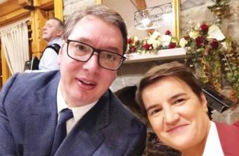 „Sre}na {to ga imamo! Najja~i na svetu" (Premijerka Ana Brnabi} je na Instagramu oka~ila fotku sa ve~ere sa predsednikom Aleksandrom Vu~i}em, ne kriju}i zadovoqstvo “{to ga imamo”. Nedugo zatim, Vu~i} se “drugarski” zahvalio premijerki.)