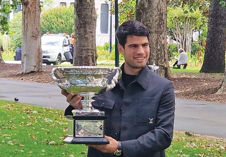 Park ispred Rojal Egzibi{n Bildinga izabran je za tradicionalno fotografisawe {ampiona Australijan opena, a ta~no u 11 ~asova, Karlos Alkaraz pojavio se hodaju}i niz travwak sa trofejem Normana Bruksa u rukama.