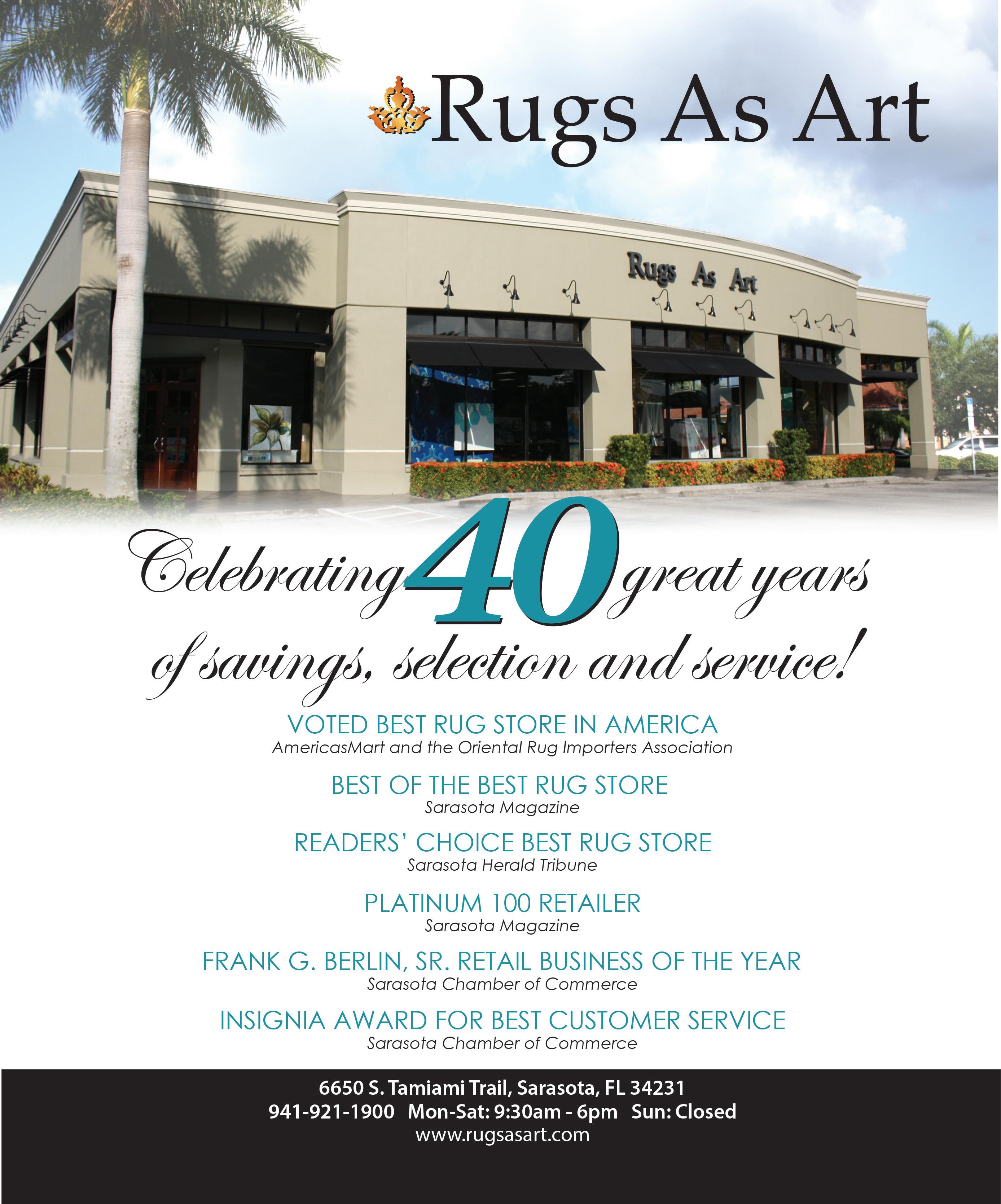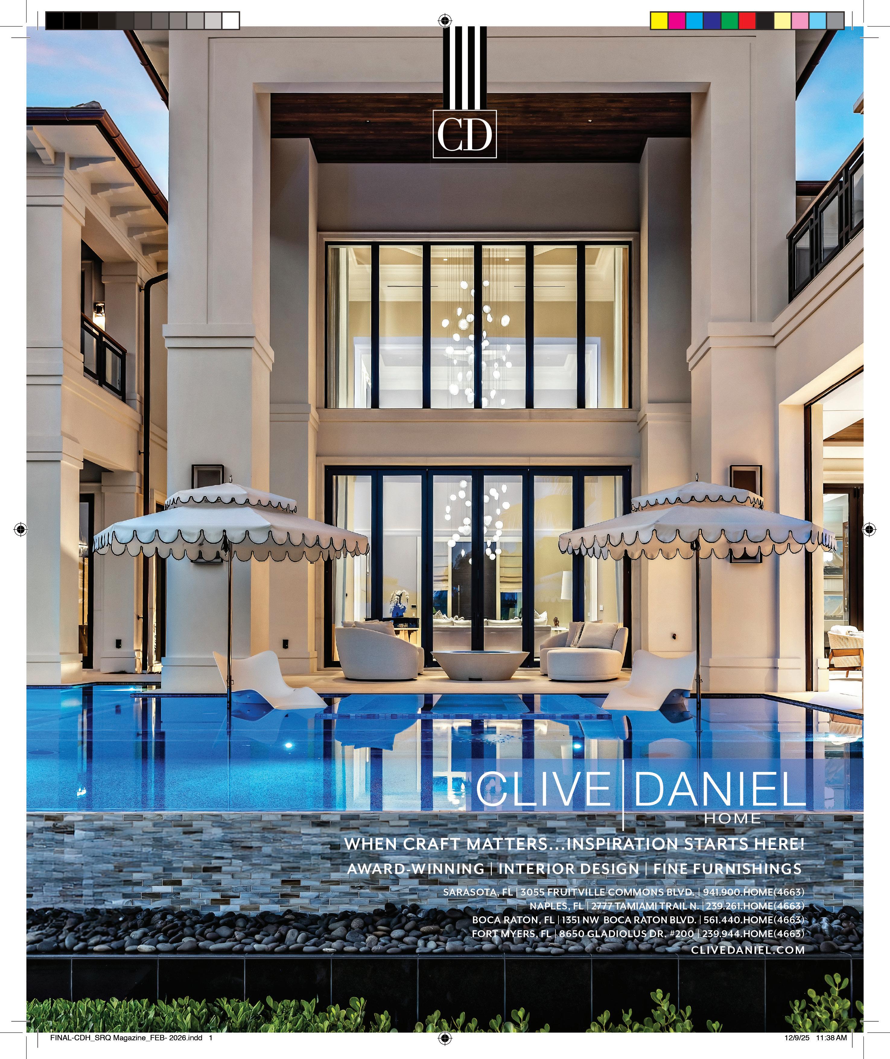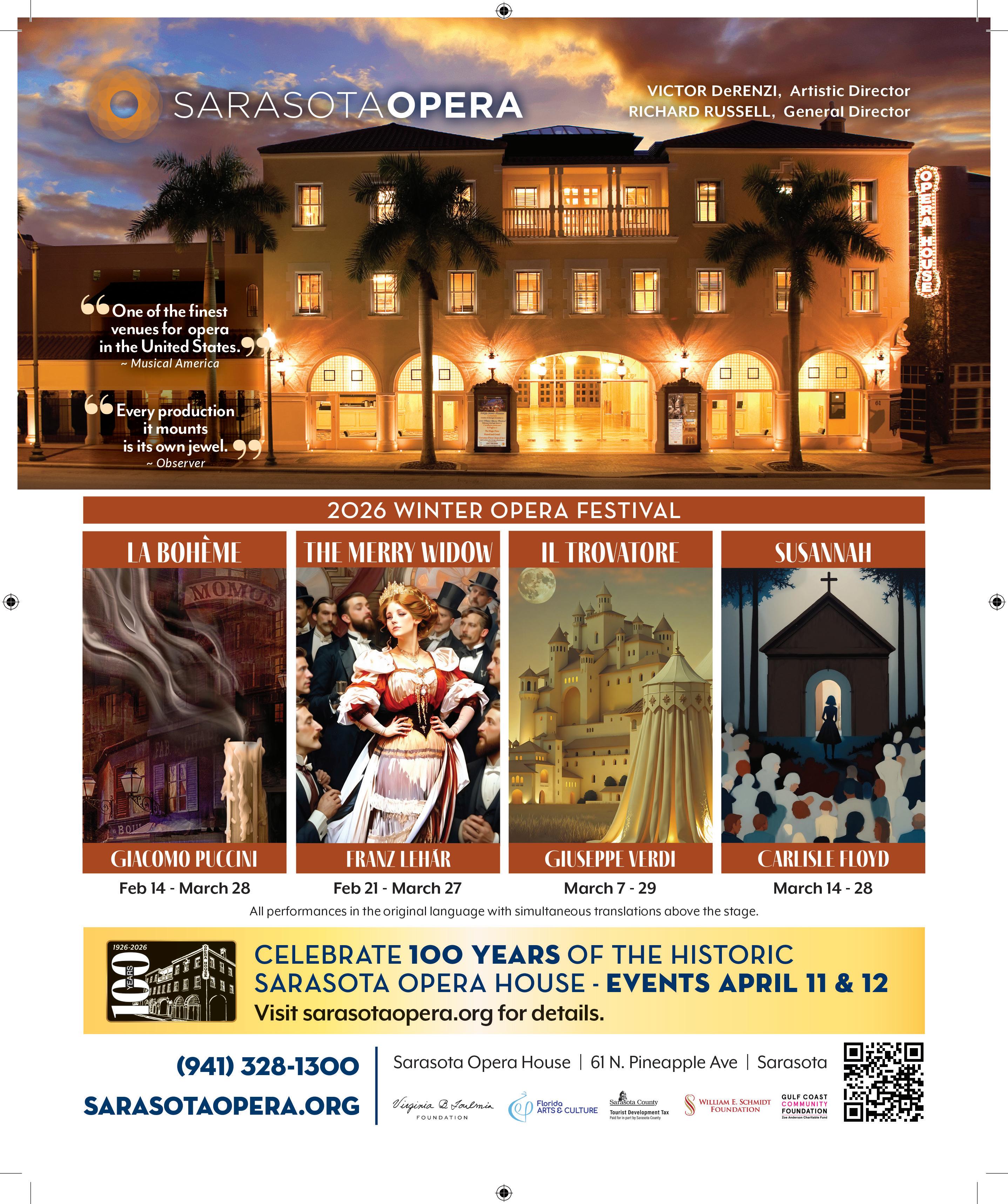 SUBSCRIBE TO THE PRINT AND DIGITAL EDITION Join our readers in the pleasurable experience of receiving SRQ Magazine in your mailbox every month during season and bimonthly during the summer. To reserve your subscription, provide your information and payment online. You can set up multiple addresses, renewals and special instructions directly through your online account. When you subscribe online, your first print issue will arrive in your mailbox in 6-10 weeks. Subscribe online at SRQMAG.COM/SUBSCRIBE. Contact us via email at subscribe@srqme.com