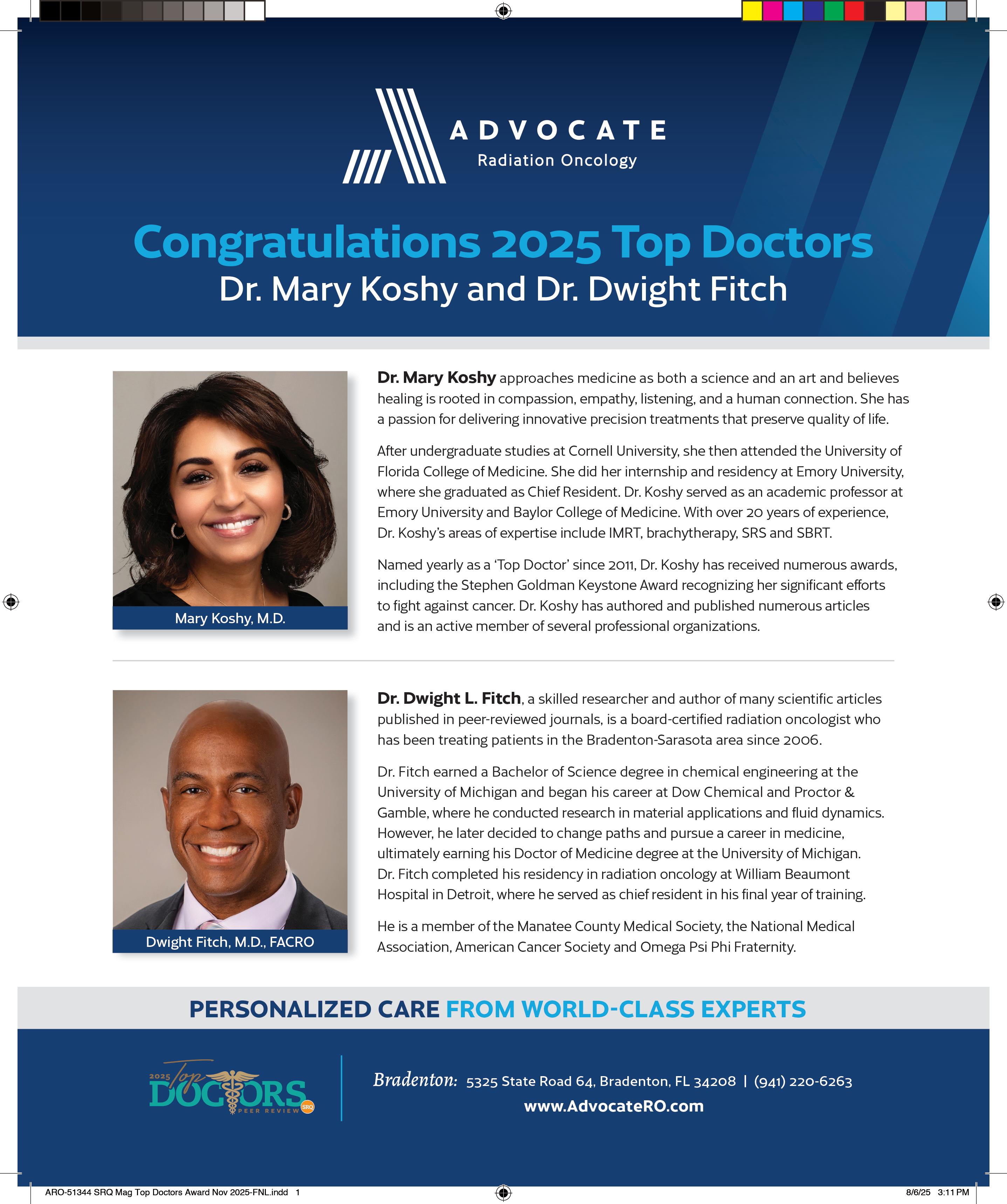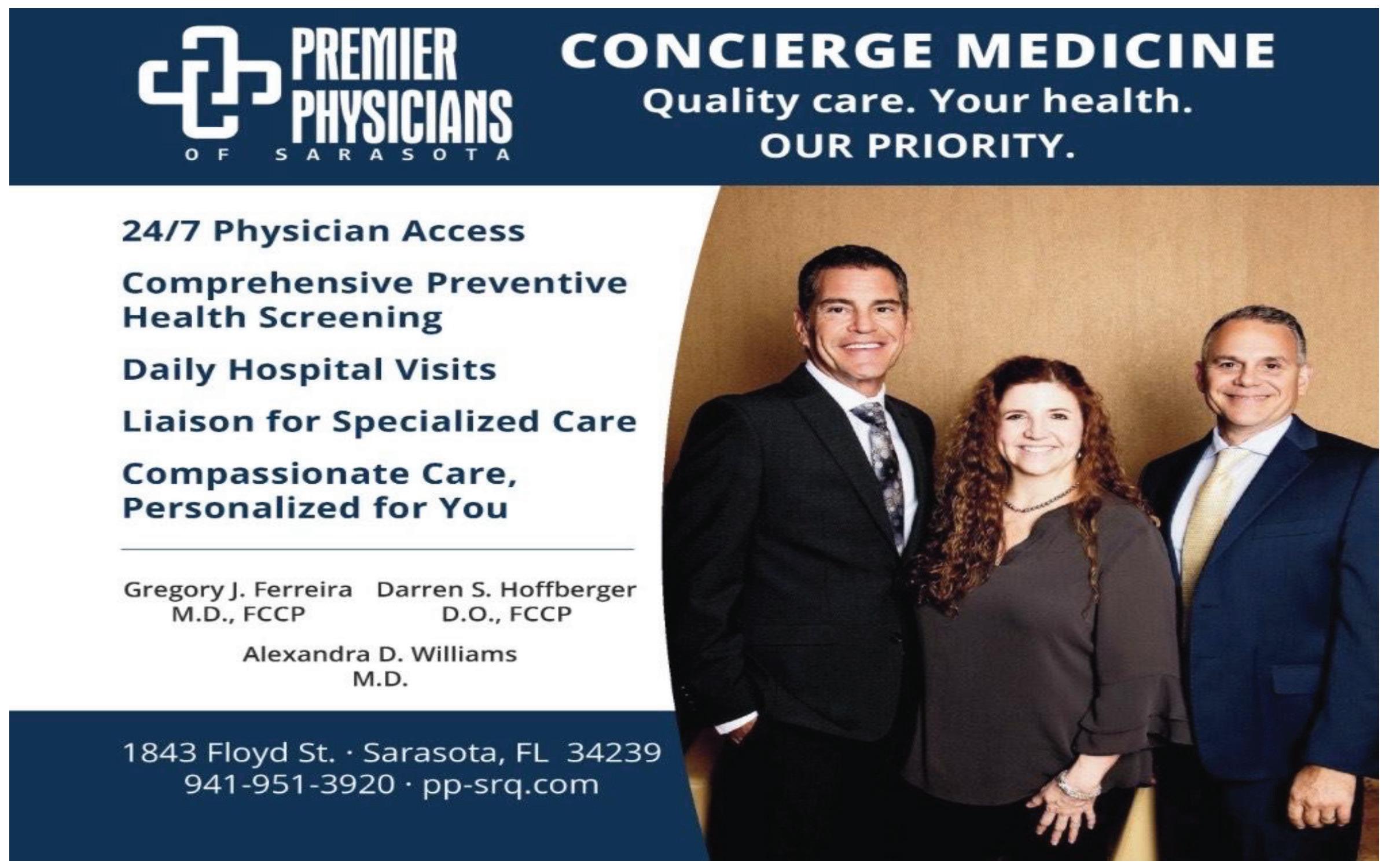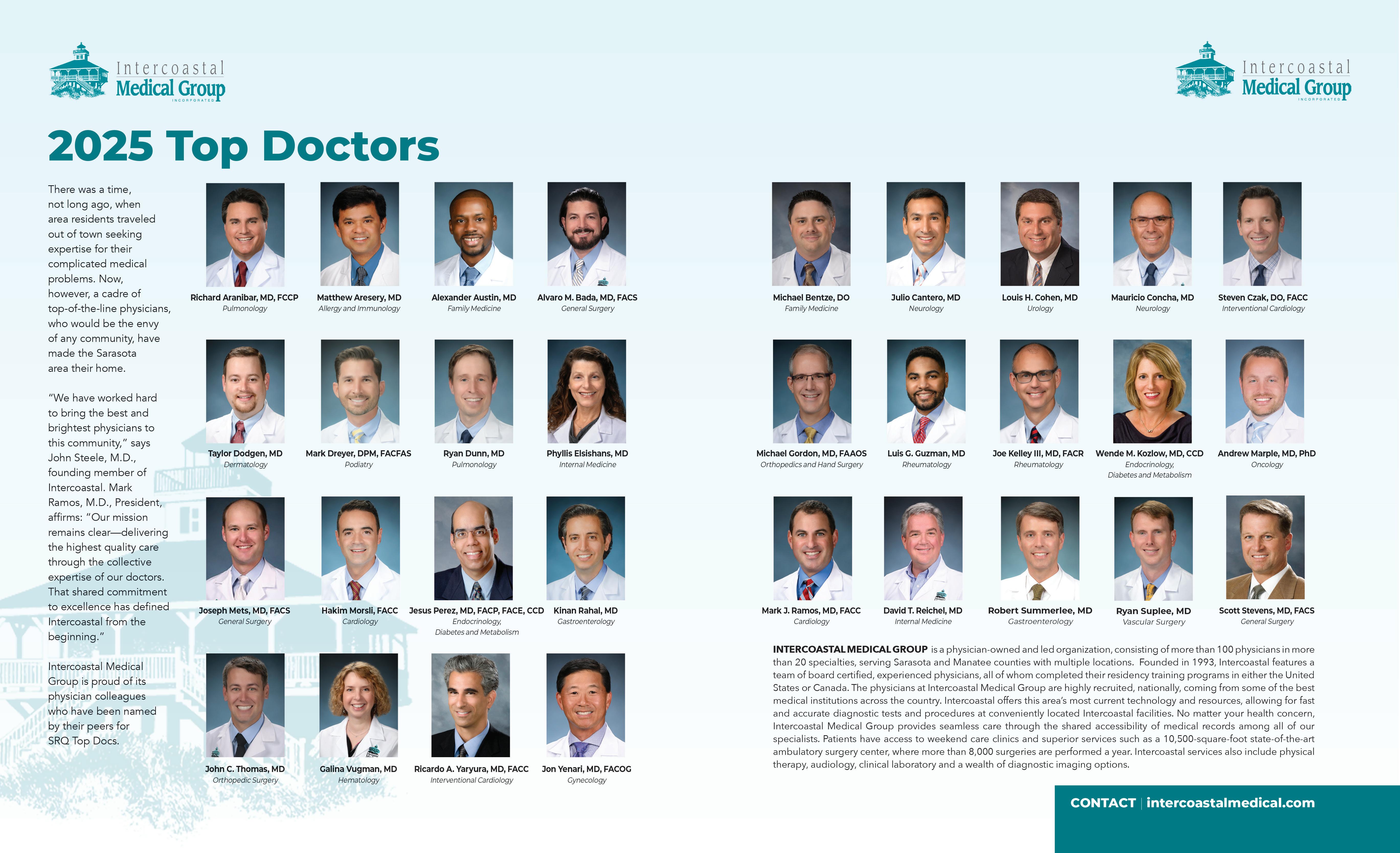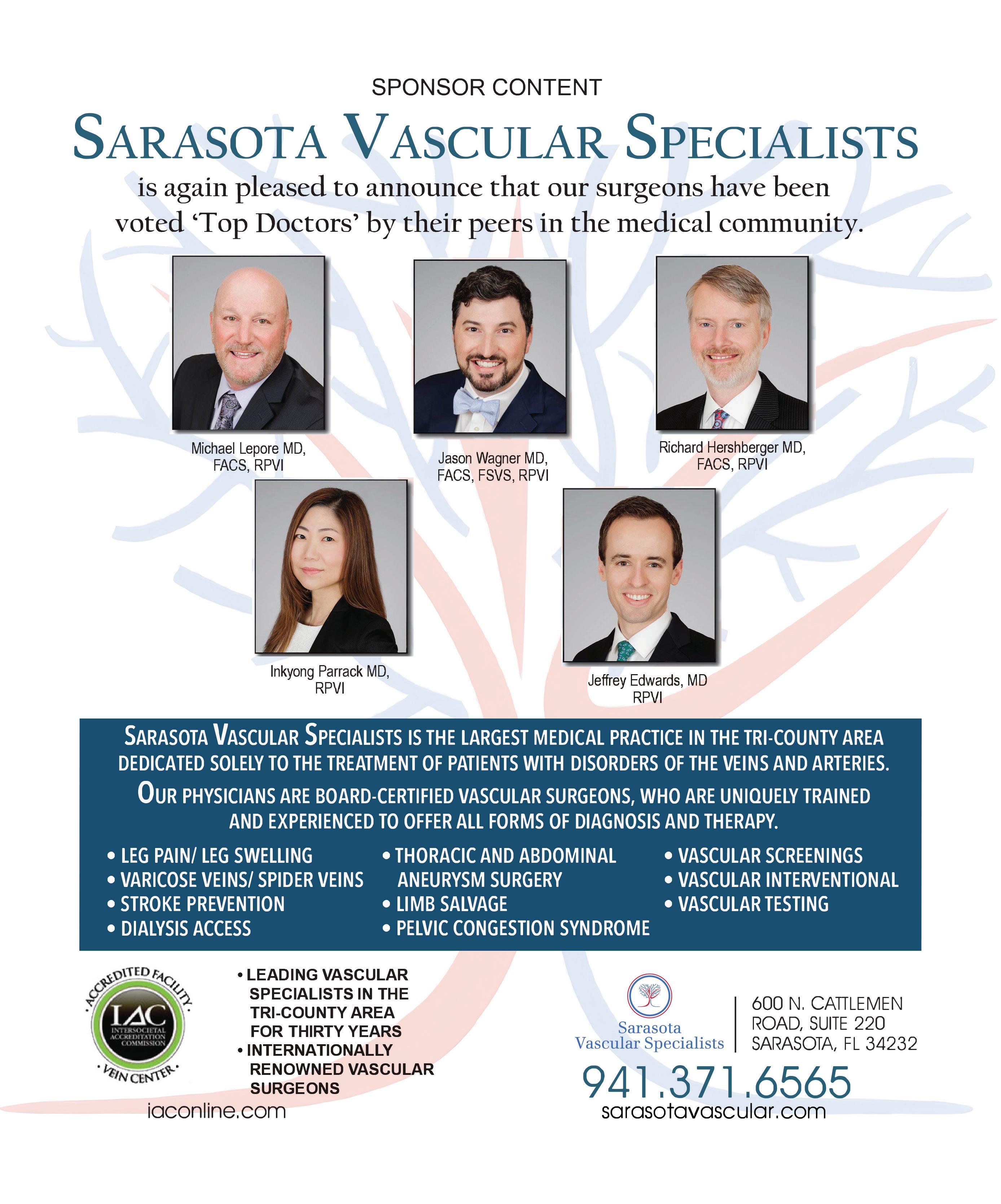 WE ARE INCREDIBLY GRATEFUL to the medical and nursing professionals who are dedicated to supporting the health and wellness of our Greater Sarasota community. The individuals who are being honored in this year's prestigious SRQ TOP DOCTORS | PEER REVIEW program have received the overwhelming support of colleagues in the medical professional communities of Palmetto, Anna Maria Island, Holmes Beach, Bradenton, Lakewood Ranch, Sarasota, Venice and North Port, Florida. The Colorado-based team at DataJoe Research facilitates all aspects of the online peer-voting process and conducting government references. We appreciate the doctors who participated in the program this past summer by sharing their thoughtful nominations—it is their insight that makes it possible for us to provide the readers of SRQ Magazine with this noteworthy guide to the highly-regarded doctors in the region.