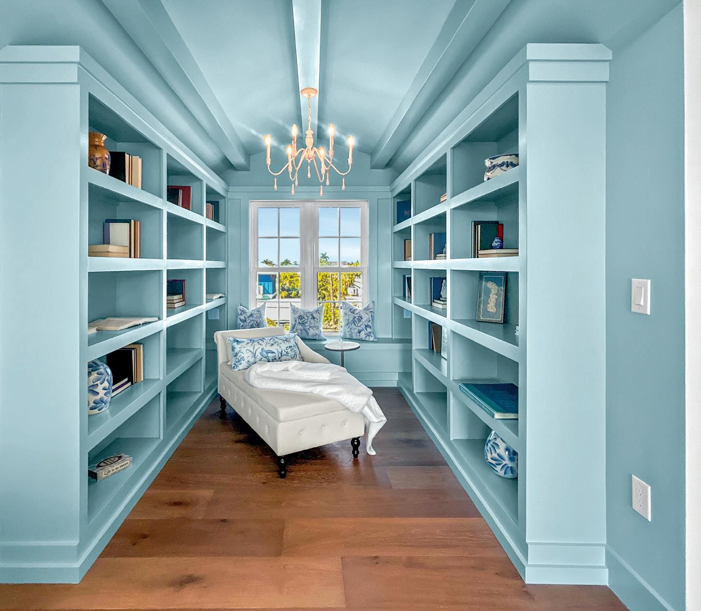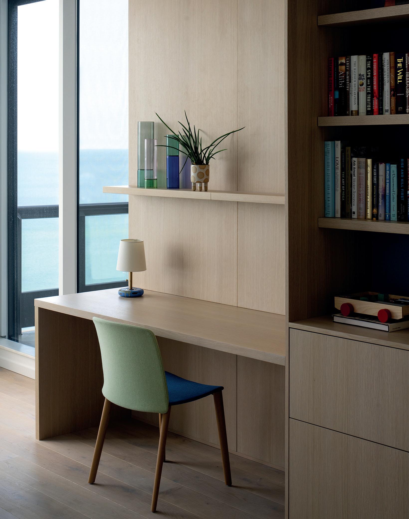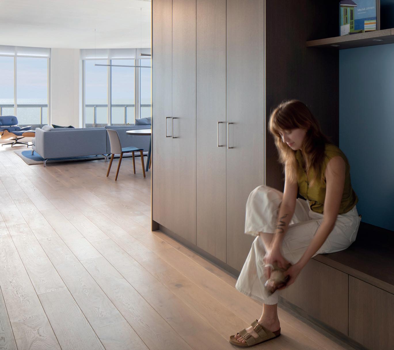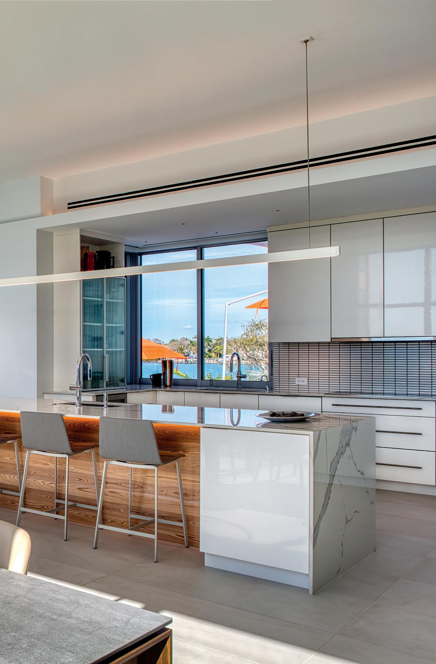 Perched high above the Gulf of Mexico in a condominium tower on Longboat Key, the Waterclub project replaces an awkward 1980s interior with an airy, serene residence that celebrates the deep blue and green hues of the surrounding water. The renovation transforms a dated plan into a calm, light-filled retreat with clear sight lines, intuitive circulation and a strong connection to the horizon beyond. The design began with a complete interior gut, removing all finishes, fixtures and wall framing to establish a clean slate. Working within the constraints of existing plumbing, HVAC chases and structural elements, the floor plan was carefully reconfigured to open views across the Great Room and improve flow between spaces. The resulting layout emphasizes clarity, balance and visual continuity. Smooth white walls are grounded by white oak flooring, bringing warmth and texture throughout the home. That same white oak reappears on dropped ceiling planes in the Kitchen and Hallway, reinforcing a more intimate scale and creating a sense of enclosure through natural materials. These lower, wood-clad ceilings heighten the experience of the Great Room, where a tall ceiling and large glass sliders draw the eye outward toward the shimmering Gulf. To maintain clean ceiling planes, recessed downlights were minimized in favor of perimeter cove lighting with concealed LED strips. This indirect illumination washes the walls and subtly separates horizontal and vertical planes, while minimalist linear pendants accent larger spaces. Custom built-ins establish a cohesive language of oak and carefully placed color. A gray oak cabinetry block defines the transition between Entry Hall and Kitchen, integrating entry storage, seating, pantry space and appliances. Finishes throughout echo the Gulf’s shi ing blues and greens, with moments of whimsy such as a periwinkle tile backsplash, an internal kitchen window and a glossy blue powder room faucet adding brightness within an otherwise serene pale e.