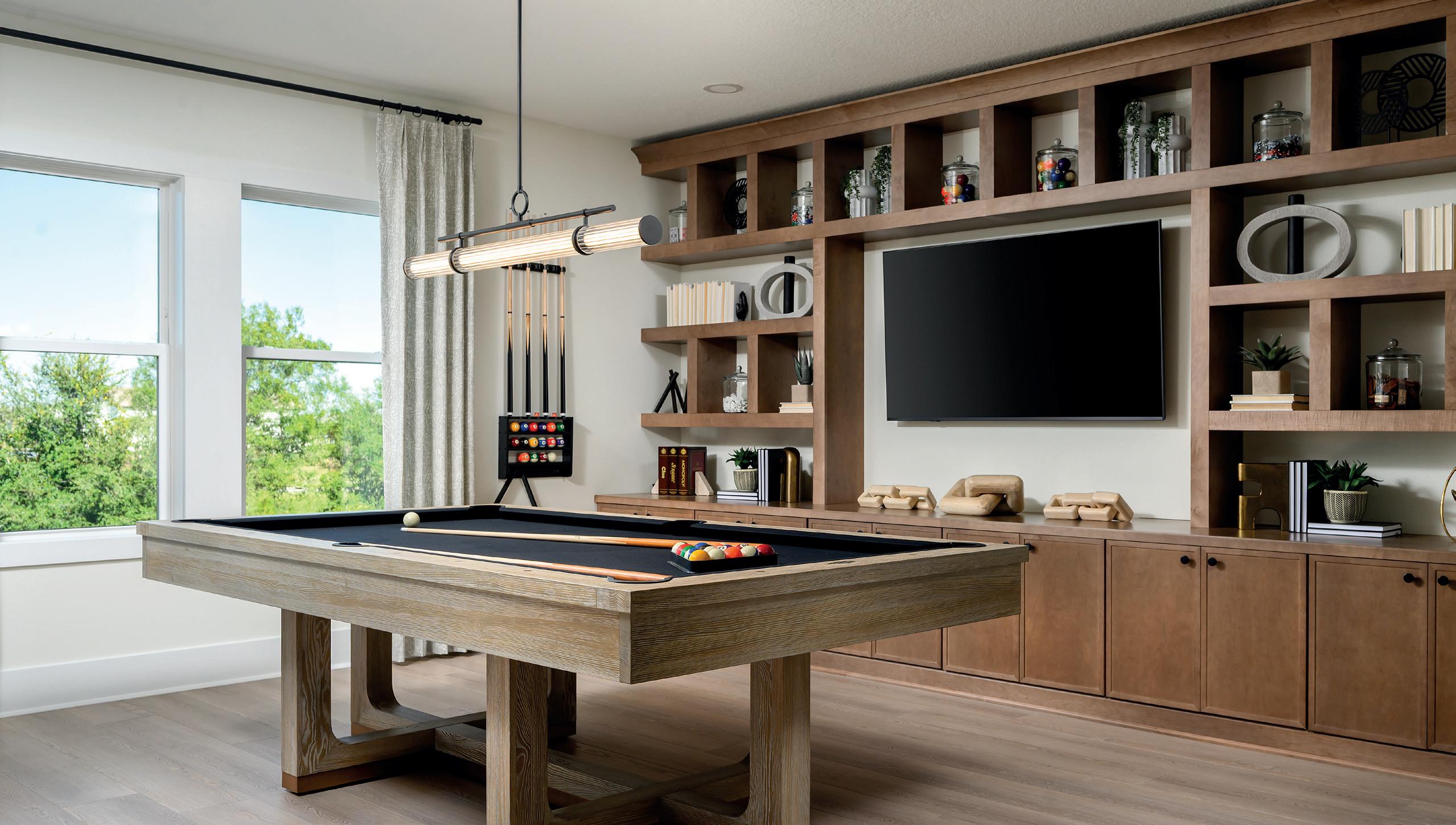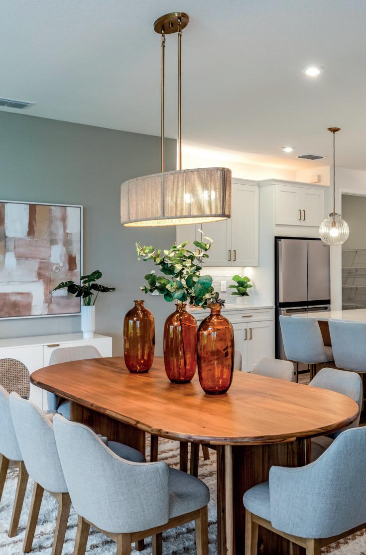 As a model home, the residence was designed to resonate with a broad and discerning audience, while still feeling layered, intentional and emotionally engaging. Our approach centered on creating a space that felt versatile yet distinctive, one that could appeal to a wide range of lifestyles without sacrificing character or warmth. Throughout the home, we introduced a thoughtful mix of textures, tonal variation and subtle moments of surprise that keep the interiors feeling elevated, welcoming and deeply connected to the surrounding natural landscape. The overarching goal for the project was to cra a light-filled, transitional home that balances refined design with everyday livability. So neutral tones, warm wood elements and gently arched architectural details were used to establish a cohesive visual language that flows seamlessly from space to space. These elements unify the interiors while allowing each room to feel purposeful and thoughtfully composed. The result is a home that feels calm and grounded, yet rich with detail and visual interest. A key challenge was maintaining a sense of visual restraint within an open-concept floor plan, while still accommodating the functional needs of a modern household. Ample storage, professional-grade appliances and generous preparation and gathering areas were carefully integrated, so that function never disrupted the home’s sense of openness and ease. Strategic planning of cabinetry elevations, concealed storage solutions and clean sightlines allowed the spaces to feel expansive, organized and unclu ered. Another consideration was working within a predominantly light and monochromatic pale e, which can risk feeling flat or sterile if not handled with care. To counter this, we layered in warmth and dimension through textured materials, natural finishes, tailored millwork details, and sculptural lighting. These elements introduce depth, so ness, and a sense of quiet luxury, resulting in a home that feels both serene and dynamic, timeless yet distinctly personal.
