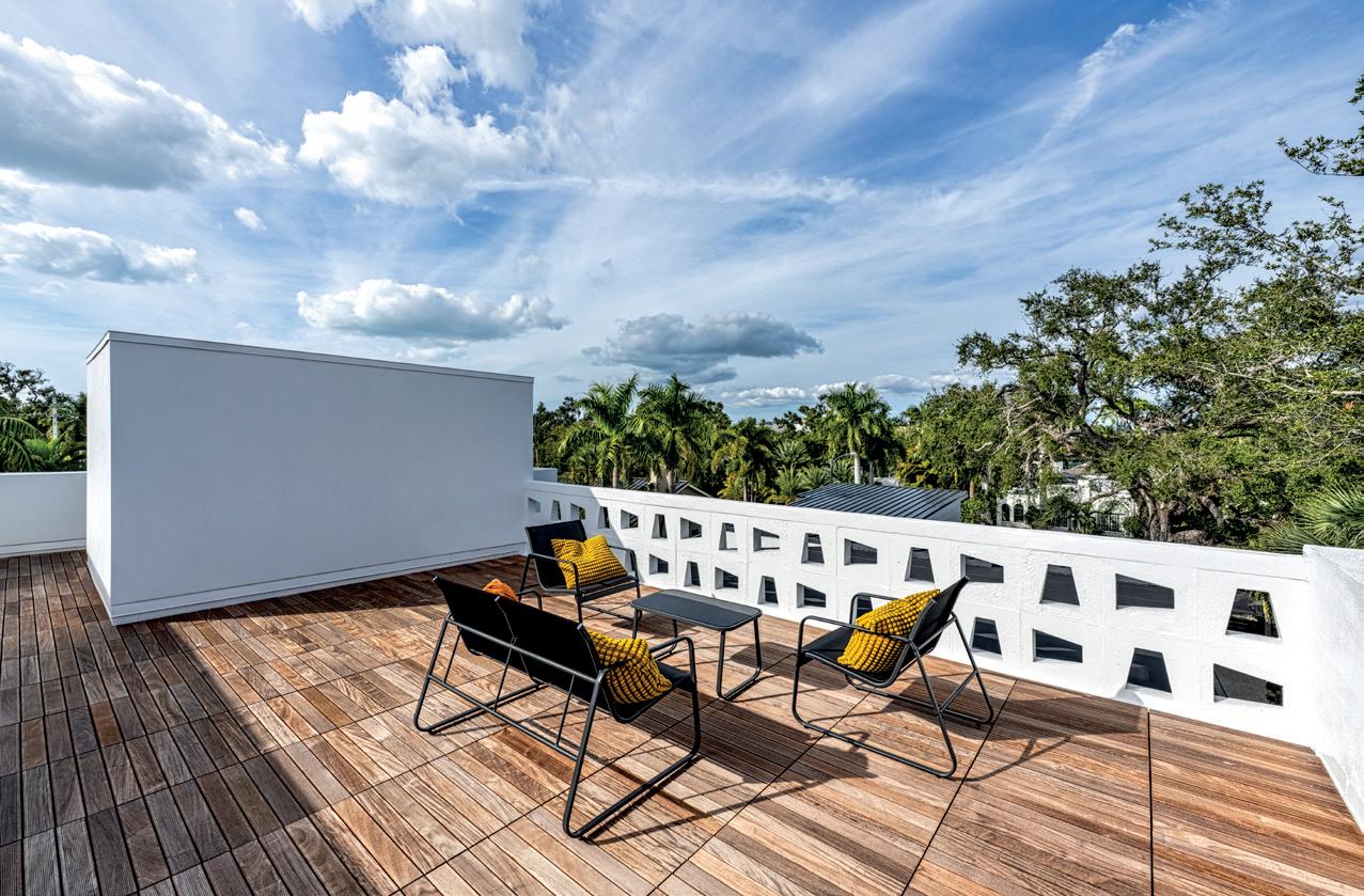 3Walls is located on a quarter-acre lot in Sarasota’s historic Avondale neighborhood. Conceived as deeply site-responsive and accessible, the 3,350 square-foot home introduces the idea of a modern bungalow. Thoughtfully addressing the scale of neighboring historic residences, the principal house is one story and opens onto an integrated pool terrace and a two-story studio and garage at the rear capped by roo op decks. The home takes its name from three walls of custom breezeblock manufactured by local cra smen. Selected a er studying dozens of options, this distinctive pa ern is incorporated on three walls, the entryway, an outdoor hallway leading to a roo op garden terrace and the upper roo op deck overlooking the pool. Together, these elements tie the site together through light, air and material continuity. Accessibility was the primary design challenge. The entire residence, including front and back entrances, circulation, bathrooms and pool deck, is fully wheelchair accessible. Rather than treating accessibility as an overlay, the design seamlessly integrates generous turning radii, roll-in showers, hidden ramps, flush thresholds and wide doorways quietly embedded within the architecture of the house. Inside, the layout focuses views and activity outward to the pool deck. Daylight reaches every room, including closets and pantries, reinforcing the project’s commitment to wellness, functionality and thoughtful modern living. The secondary structure houses an outdoor kitchen, pool bath, garage and studio. Two roo op decks provide additional areas for entertaining, gardening and framed views of the treetops, while a custom pool enclosure reinforces the home’s geometry. The residence is elevated above street level for flood resiliency and includes energy efficient windows, LED lighting, EnergyStar appliances, low-flow fixtures and a highly insulated building envelope. During design and construction, a mature live oak was preserved and thoughtfully integrated into the overall site plan.