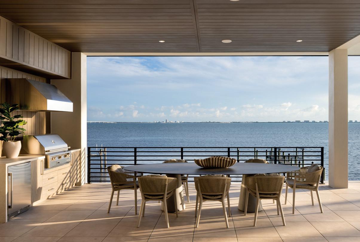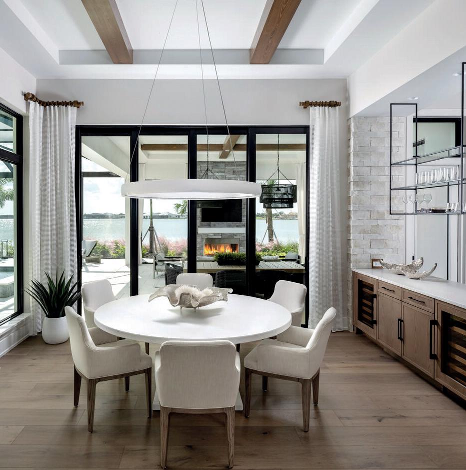 This contemporary Sarasota residence is designed as a calm, airy refuge that celebrates the relationship between architecture, water and landscape. The home’s long, linear form rests lightly above a 48-foot lap pool and a continuous water feature that mirrors the full length of the structure. This elevated composition creates the impression that the house is floating, allowing the pool and surrounding landscape to play an essential role in the overall design. Along the main living areas, large glass walls pocket completely out of view, opening the home to the tropical oasis that surrounds it. When these walls disappear, the interior becomes an openair pavilion where breezes move freely through the great room, kitchen and dining spaces. Reflections from the pool cast so , shi ing pa erns across the architecture throughout the day, reinforcing a subtle connection to the natural environment. Strategic consideration shaped the home’s form to filter out unwanted views while preserving only lush tropical vistas from every room. The result is a se ing that feels curated yet effortless, allowing the built environment and natural elements to reinforce one another. Inside, materials were selected for warmth, clarity and quiet sophistication. Natural stone, white oak and coastal-inspired finishes create continuity from room to room. Every detail was considered to enhance flow and comfort while maintaining the home’s refined aesthetic. This residence reflects a thoughtful dedication to livable modern design. It functions as both a private sanctuary and a place for gathering, shaped by Sarasota’s light, climate and lifestyle. The architecture invites an easy rhythm of indoor and outdoor living, creating a home that feels balanced, timeless and distinctly of its place.