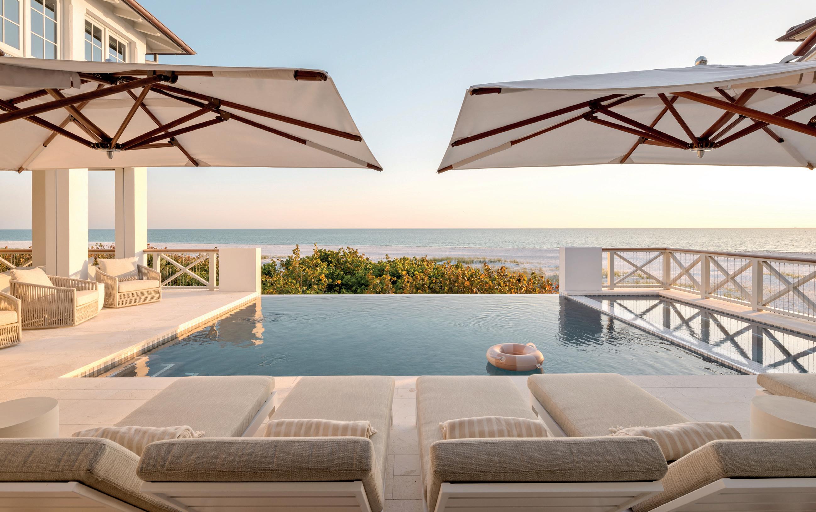 The vision for this 5,180 sq. . Sarasota Bay home was to create a residence that embraces life on the water through continuous indoor-outdoor living. Surrounded by water on two sides, the design integrates multiple levels of outdoor space, encouraging time spent outside in every season. Covered balconies provide shade and protection from the elements, allowing uninterrupted enjoyment of views and breezes year-round. Expansive terraces and elevated entertainment areas extend the living experience beyond the walls, creating generous spaces for dining and gathering while overlooking the bay. The centerpiece of the outdoor design is a dramatic cantilevered pool, suspended 17 feet above grade and visually merging with the bay beyond. As the first elevated pool permi ed in a VE Zone in Sarasota, it anchors the home’s outdoor living concept and frames sweeping sunset vistas to the west. Its position creates the sensation that pool and bay are nearly continuous, blurring the boundary between architecture and nature. Balconies and terraces flow seamlessly from interior spaces, reinforcing the connection between indoors and outdoors while offering panoramic views from every angle. The landscape design complements this vision with native plantings that minimize irrigation and harmonize with the coastal se ing. Large outdoor entertainment zones, shaded seating areas and water-facing balconies create a layered experience that celebrates the site’s unique relationship with Sarasota Bay. The result is a home where architecture and landscape work in concert, delivering a lifestyle centered on nature, light and water, an elevated retreat designed for relaxation, entertaining and timeless waterfront living.