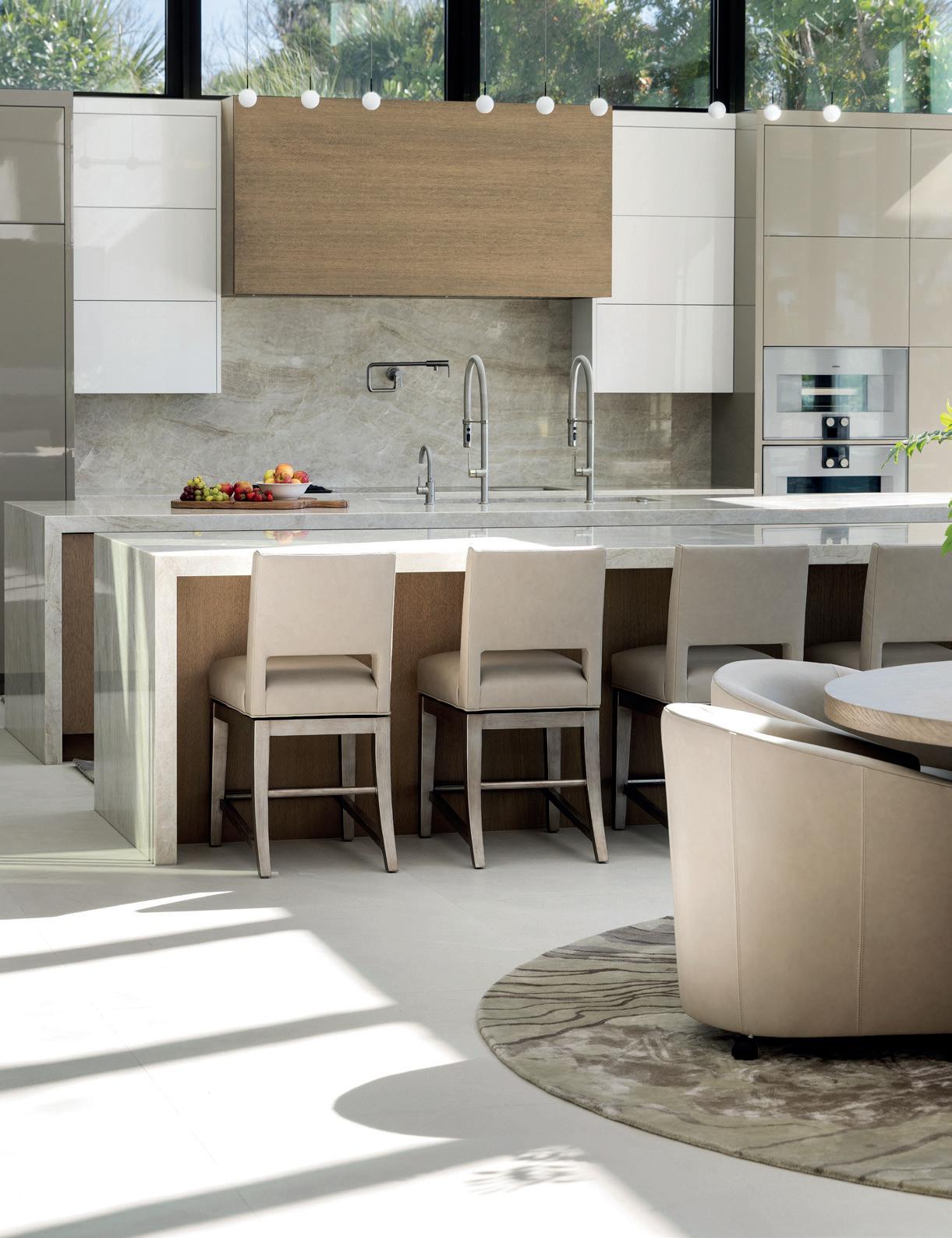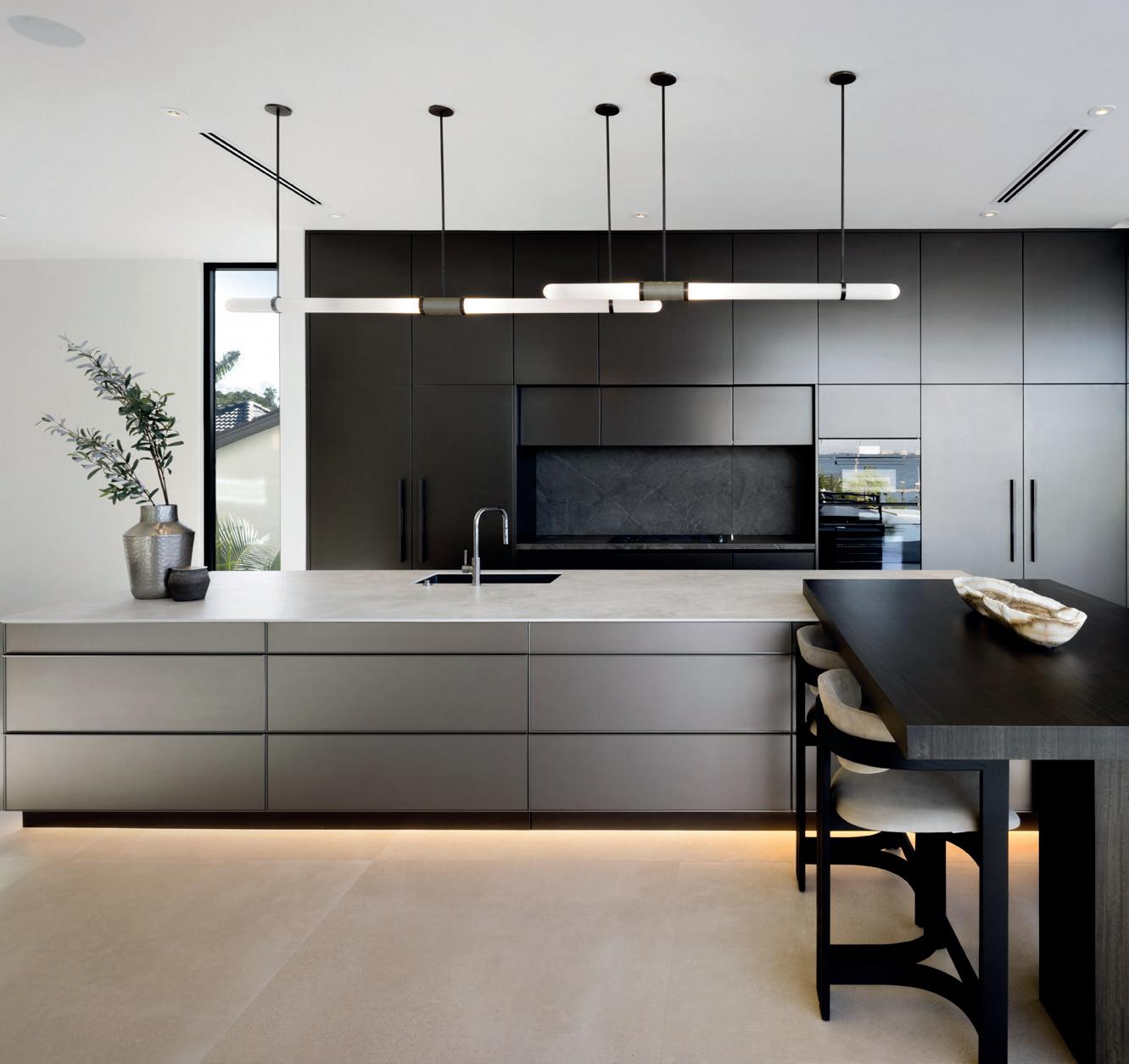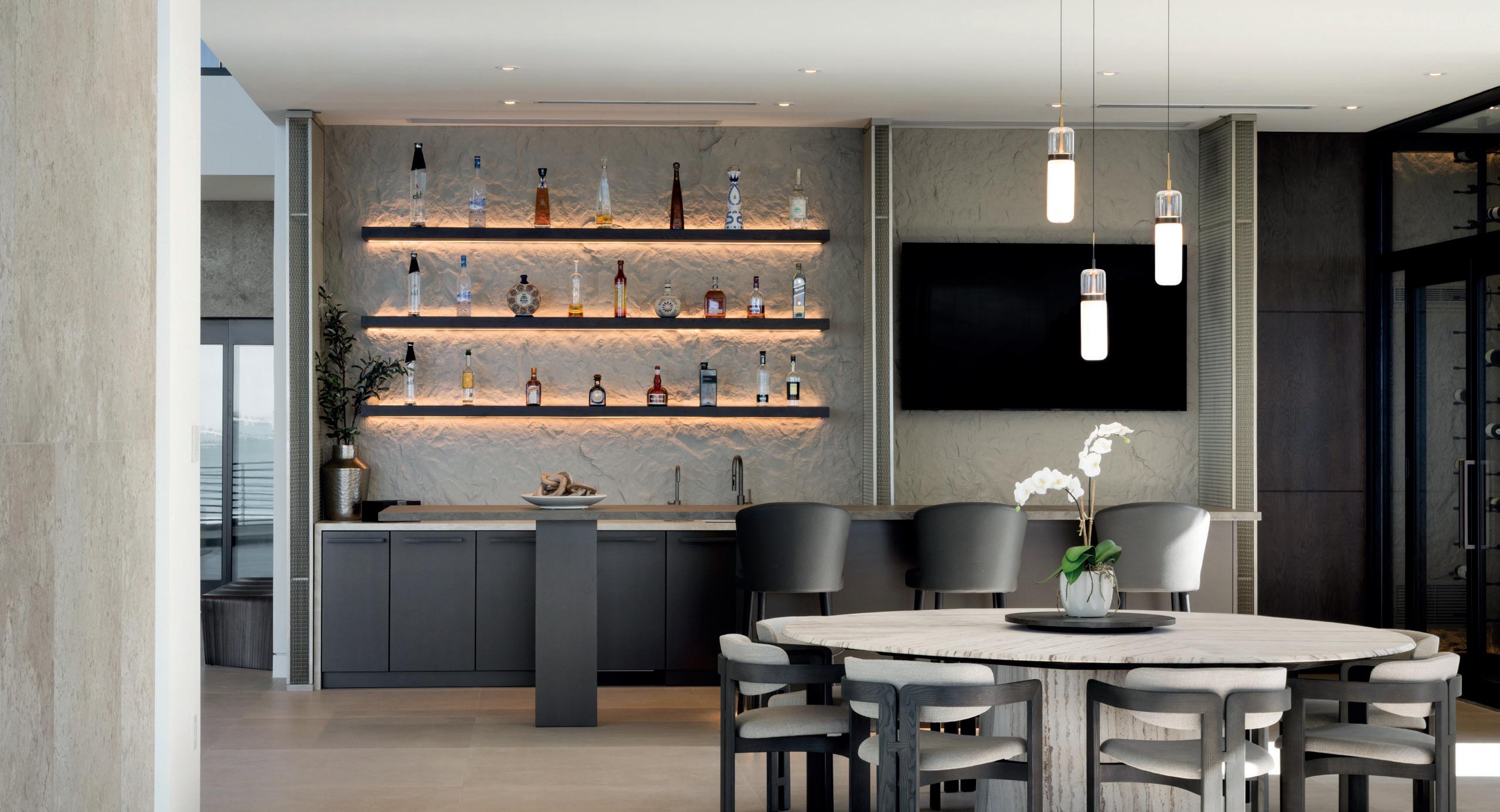 The owner and interior designer describes the residence as an expression of a refined pale e defined by sophistication and calm. Steeped in a forward-looking sensibility, Lunara transforms state-of-the-art materials from around the world through the enduring cra of local artisans. With design influences drawn from Spain, Tulum and California, every angle captures the shimmer of water, every surface plays with light and every room invites a life surrounded by beauty in Sarasota. The statement kitchen serves as both a showstopping feature and the energetic heart of the home. Situated on a peninsula wing, the living space extends well beyond its perimeter walls. Corner pocketing glass panels open fully to cascade entertaining outdoors to an al fresco kitchen, dining area and pool deck. Hidden drainage is captured below the paver deck, allowing the transition between interior and exterior spaces to remain seamless and level. The cabinetry becomes a chromatic expression of Spanish opulence through a custom finish known as zinc bronze, paired with a so taupe pale e inspired by the sands of Tulum, Mexico. Dekton countertops and backsplash introduce a factory-made stone surface that anchors the space with earthen striations and exceptional durability. The backsplash itself conceals a key entertaining feature, it slides open to discreetly transfer used dishes into a hidden prep kitchen behind, allowing the primary space to remain pristine until the gathering concludes. Flanking the kitchen is a coordinating zinc bronze bar top with stone detailing and a metal racking display wall. The floating bar integrates refrigeration, a chilled wine display and a countertop pop-up TopBrewer designed to dispense seltzer and juices for any preprogrammed cocktail. Throughout the home, Lunara reflects a refined balance of innovation and cra smanship. Light, water and materiality are treated as architectural elements, creating spaces that feel intentional, immersive and deeply connected to their coastal se ing.