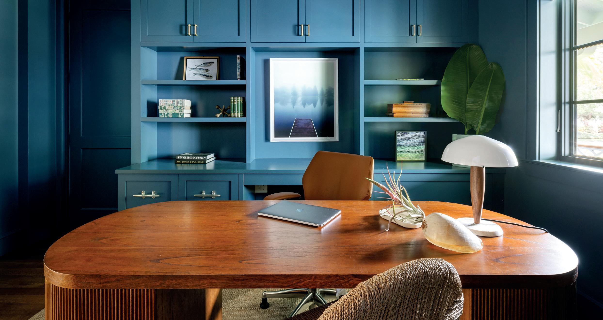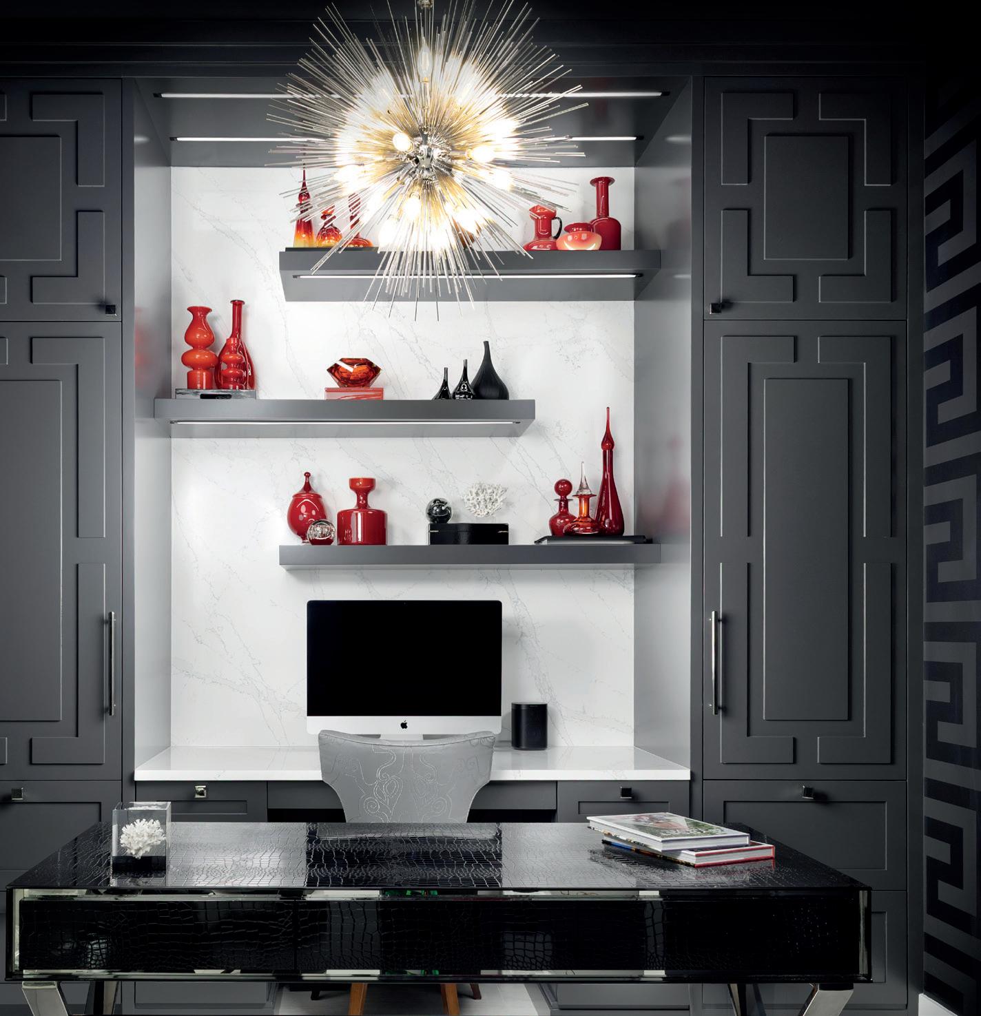 Bayso Mediterranean is a richly layered study in bespoke cra smanship, conceived as a fully custom home office rooted in European character and artistry. The vision was to create a highly detailed Mediterranean-inspired environment where every surface, trim and cabinet detail feels intentional and finely worked. The design embraces bold elements including pa erned wallpaper, sculptural lighting and curated furnishings, all unified through intricate custom millwork. The cabinetry is the architectural soul of the space. Each piece was designed and fabricated specifically for this room, featuring engraved decorative detailing and custom-profiled edges cra ed in Pennsylvania. Shelving was precisely dimensioned to display the homeowners’ collected vases and treasured objects, allowing the cabinetry to function as both a display canvas and a structural element. A seamlessly integrated panel conceals the Sub-Zero wine cooler, allowing it to disappear into the surrounding woodwork and preserve uninterrupted cabinet elevations. A leather-wrapped table adds tactile richness and reinforces the refined old-world sensibility of the room. Every curve, profile and proportion was considered with the care traditionally reserved for fine furniture, elevating the space beyond a standard home office. The result is a room that feels collected, storied and deeply personal rather than manufactured. Bayso Mediterranean reflects a commitment to artistry and technical precision, where European-influenced detailing meets modern performance and integration. The space feels luxurious, intimate and timeless, a bespoke environment cra ed entirely around lifestyle, beauty and individuality.