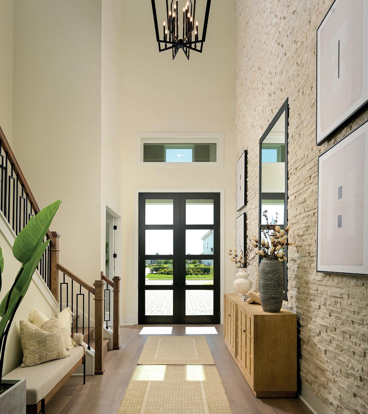 The Campania Grande II was conceived as a modern expression of Florida luxury—one that balances architectural presence with warmth, livability, and thoughtful functionality. The design challenge was to create a grand statementmaking residence that still feels approachable and intuitive for today’s homeowners, while showcasing the flexibility of the floorplan. The solution lies in a carefully curated blend of scale, flow,and refinement. Upon entry, expansive ceiling heights and clear axial views immediately establish a sense of openness and sophistication. The home’s layout is intentionally zoned to support both everyday living and elevated entertaining, with seamless transitions between formal and casual spaces. The kitchen serves as the heart of the home, functioning as both a visual anchor and a highly functional gathering space that connects effortlessly to the great room and outdoor living areas. Material selections emphasize timeless appeal through layered textures, so neutral tones and architectural detailing that adds depth without excess. With intuitive circulation, integrated storage and strong indoor-outdoor connections, the Campania Grande II exemplifies homes that feel effortless, enduring, and thoughtfully cra ed.