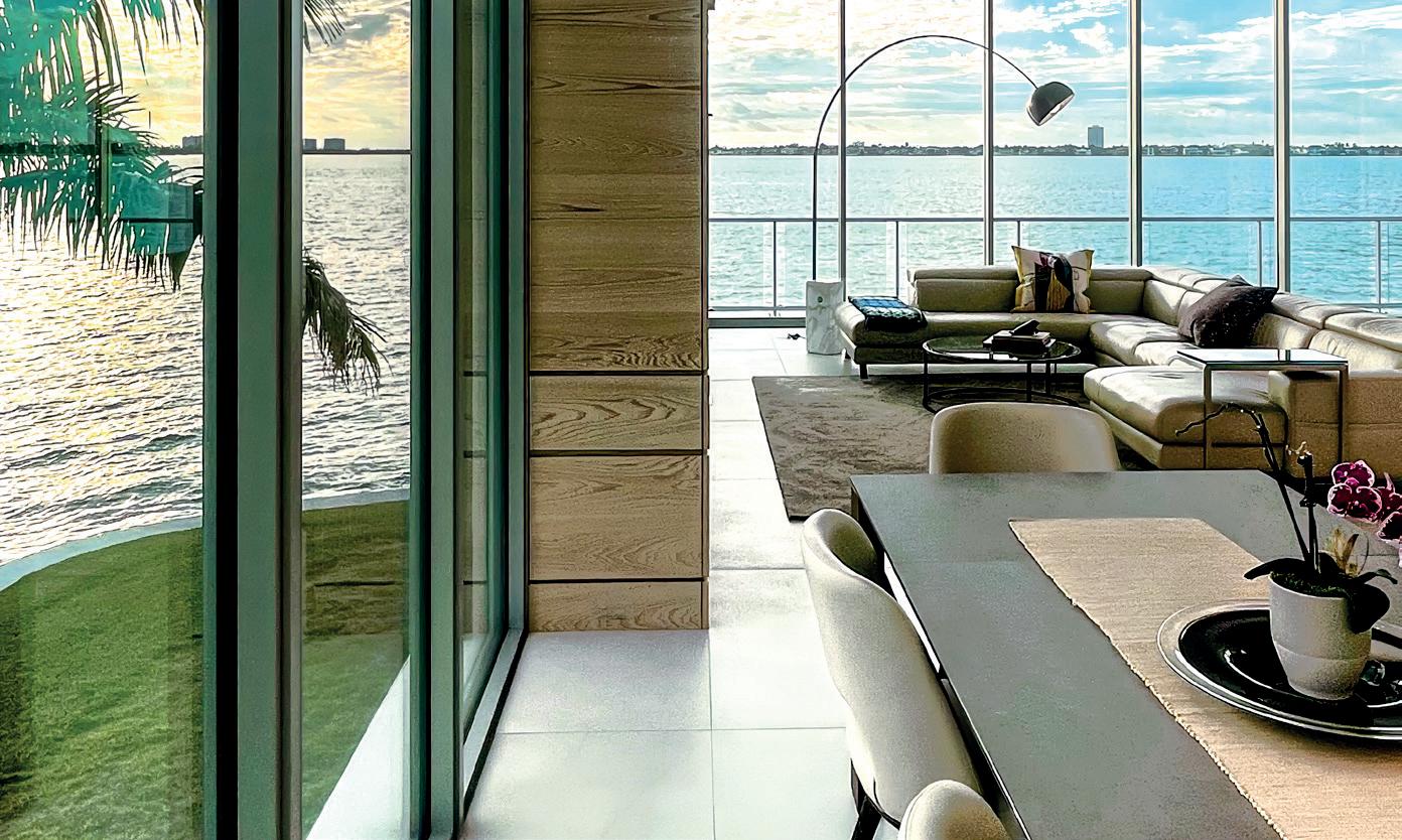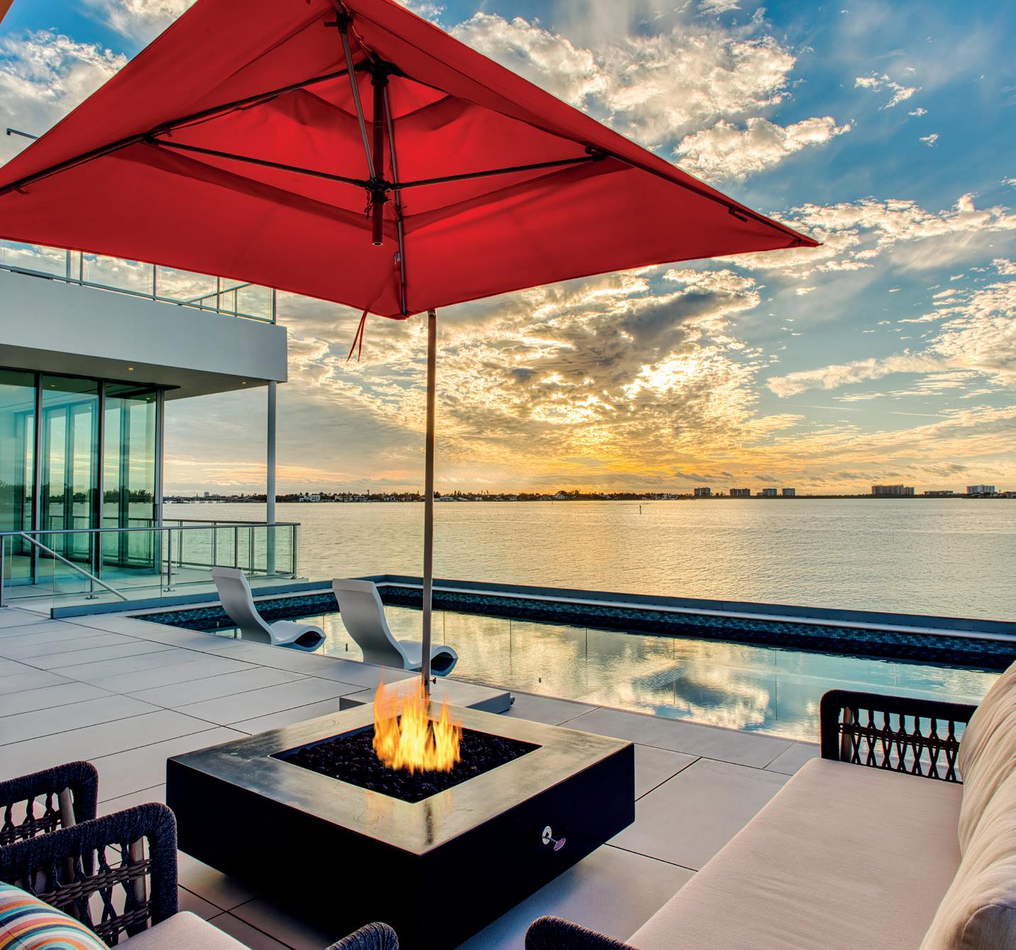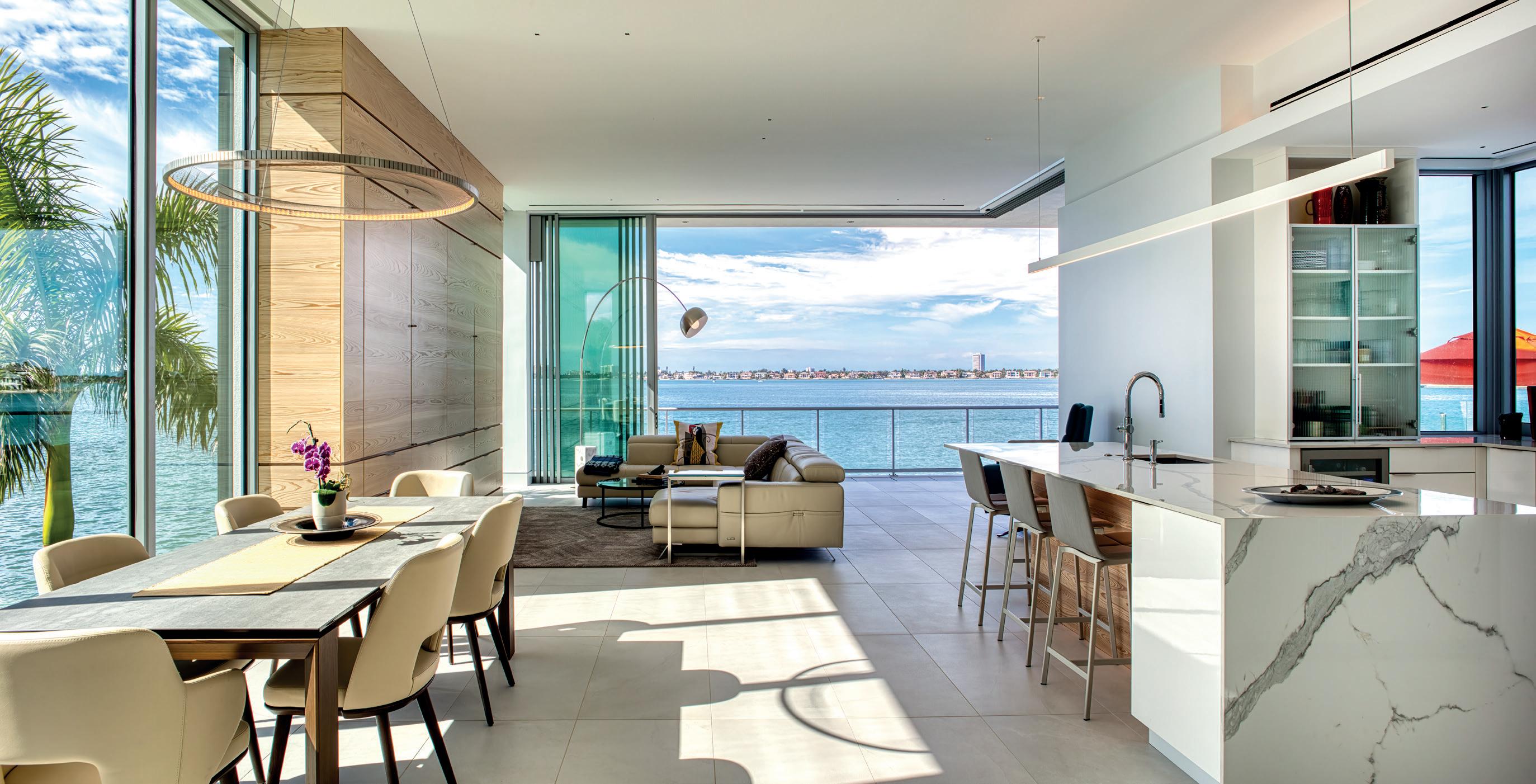 Sarasota’s cultural legacy is distilled into a forward-looking architectural expression—Lunara. Situated in Sapphire Shores, one of the city’s most historically and culturally significant neighborhoods, the home commands expansive views of Sarasota Bay and the downtown skyline, using its se ing as both inspiration and organizing principle. The design transforms the site constraints of an elevated flood zone into opportunity through a composition of intersecting volumes and floating planes, creating a new habitable horizon datum. State-of-the-art materials sourced globally are refined through the cra smanship of local artisans. Light, water and horizon are treated as architectural elements, shaping every façade, interior space and moment of arrival. Entry is marked by an 11-foot pivot door opening into a double-height living space. Framing the view, an automated glass wall fully pockets to dissolve the boundary between interior and exterior, extending to a trellised sun deck beyond. Every room opens into this great room, as a no-hallway planning strategy reinforces fluid movement throughout the home, ensuring that despite its scale, the experience remains intimate and energized. At the core of the plan, an elegant kitchen connects the opposing bar to the dining room, outdoor balconies and pool area through corner pocketing sliding glass walls. This spatial strategy is mirrored above in the primary suite, where a movable privacy glass wall allows the bath to shi between open vista and secluded spa as integrated views extend three rooms deep into the plan. Amenity spaces are conceived as architectural experiences rather than add-ons. A two-level pool cascades from an infinity edge into a dedicated lap lane, merging sculptural presence with purposeful use. A roo op deck serves as a stage for Sarasota’s unforge able sunsets and provides a flexible outdoor retreat designed for social gathering, featuring a pu ing green, firepit and adaptable open space. Lunara exemplifies architecture as both art and habitation, where innovation is grounded in cra , luxury is livable and scale is carefully moderated. The result is a residence that becomes both sanctuary and enduring icon.
