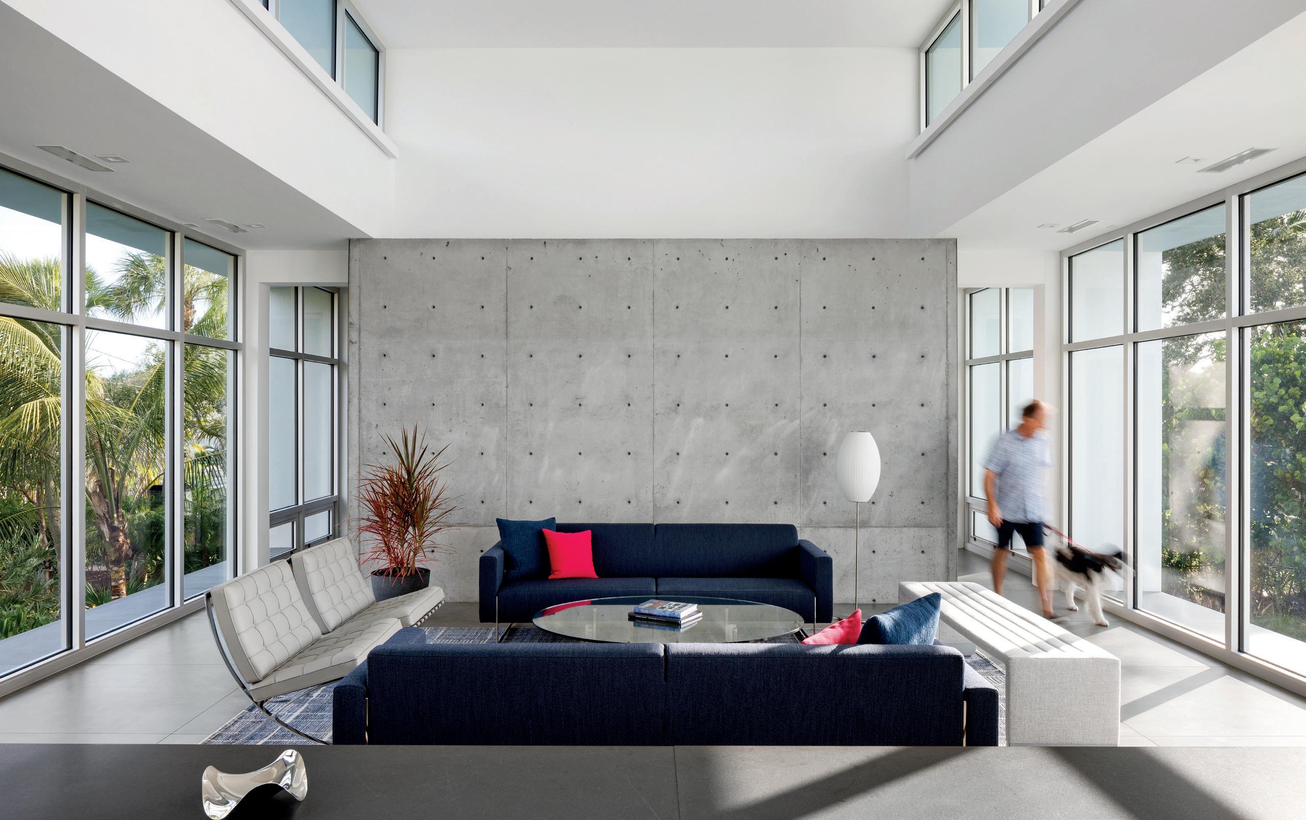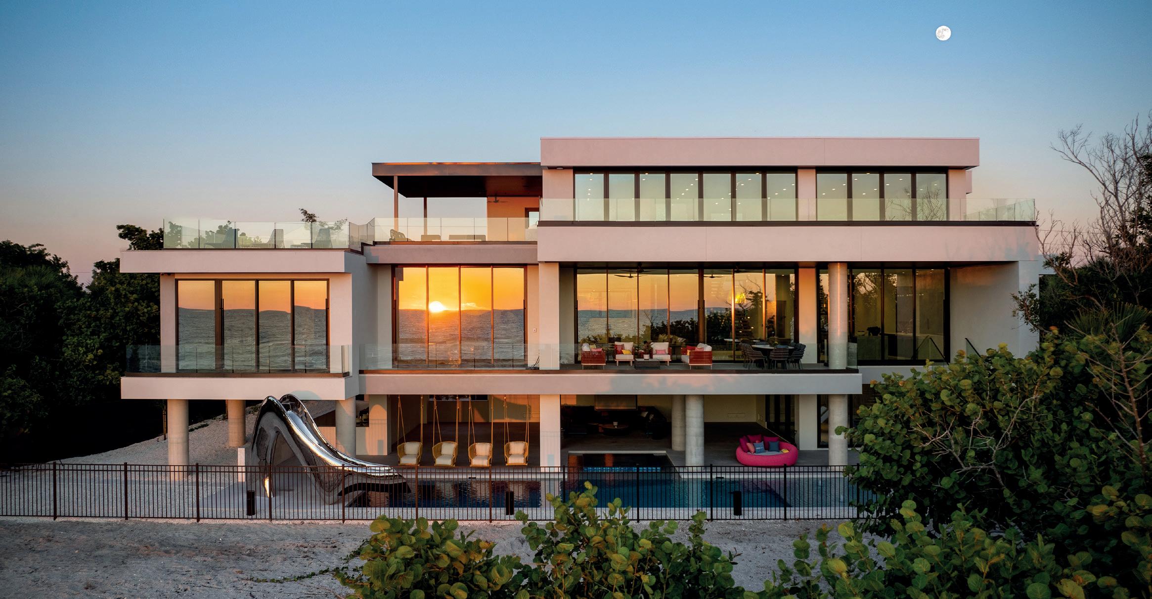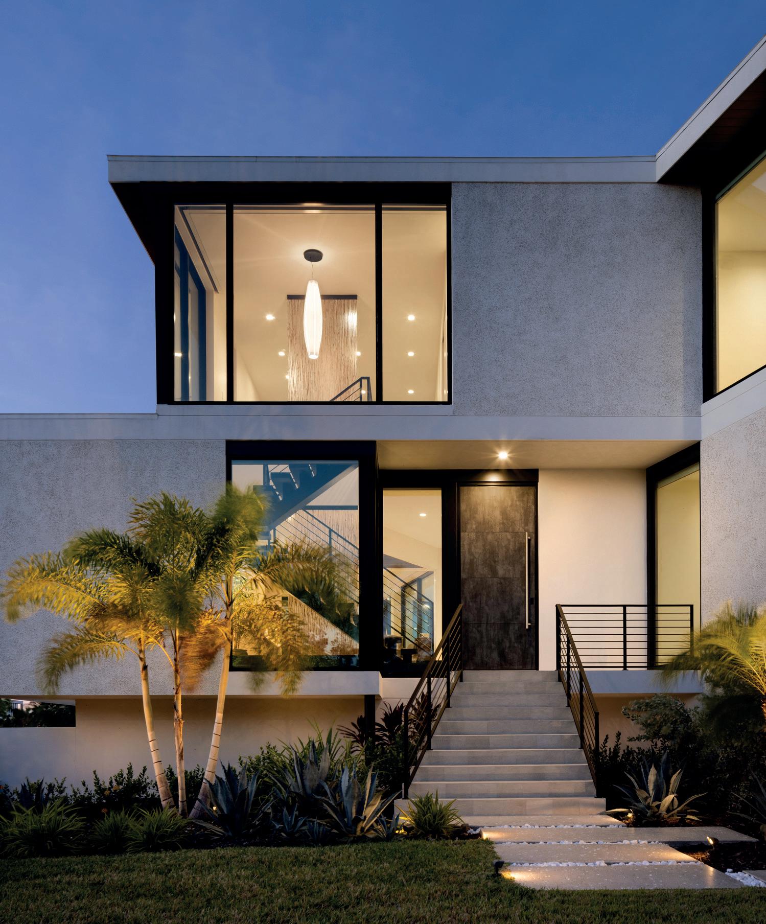 The vision for this 5,180 sq. . home on Sarasota Bay was to create a residence that supports aging in place while embracing life on the water. The challenge was designing a home for a retired couple and their family that performs effectively today and for decades to come while meeting strict high velocity (VE) flood zone requirements. The main living level was elevated 17 feet above grade to create the impression of “floating” over the landscape. Cantilevered spaces and walls of glass capture sweeping views of the bay and canal, and the west-facing pool—Sarasota’s first elevated pool permi ed in a VE Zone—anchors outdoor living and frames sunset vistas; obtaining approval for the elevated pool required a two year code review. Aging-in-place features appear throughout: wide entry doors, flush showers, easy-to-rotate handles, wheelchair-accommodating countertop heights and an elevator for full vertical access. A custom three-level staircase celebrates the daily journey from ground level to the uppermost floor. The home also incorporates performanceforward and sustainability technologies that enhance comfort and resilience. Carefully placed operable windows and sliding doors provide daylighting, ventilation, and seasonal breezes, reducing reliance on mechanical systems, while targeted shading improves yearround usability of outdoor areas. Automated controls coordinate these passive strategies with high-performance insulation and an optimized building envelope, contributing to exceptionally low energy use and a HERS rating of -3 (beyond net zero). Active systems include solar energy capture, the use of renewable/recycled materials, rainwater collection, indoor air purification and integrated data/automation. The home has earned LEED Platinum, Florida Green Building Coalition Platinum and EPA Energy Star Highest Standards, among other sustainability certifications. The result is a resilient waterfront home that enables comfortable living today, connects daily life to the surrounding neighborhood / waterways and is grounded in the future through sustainable design.