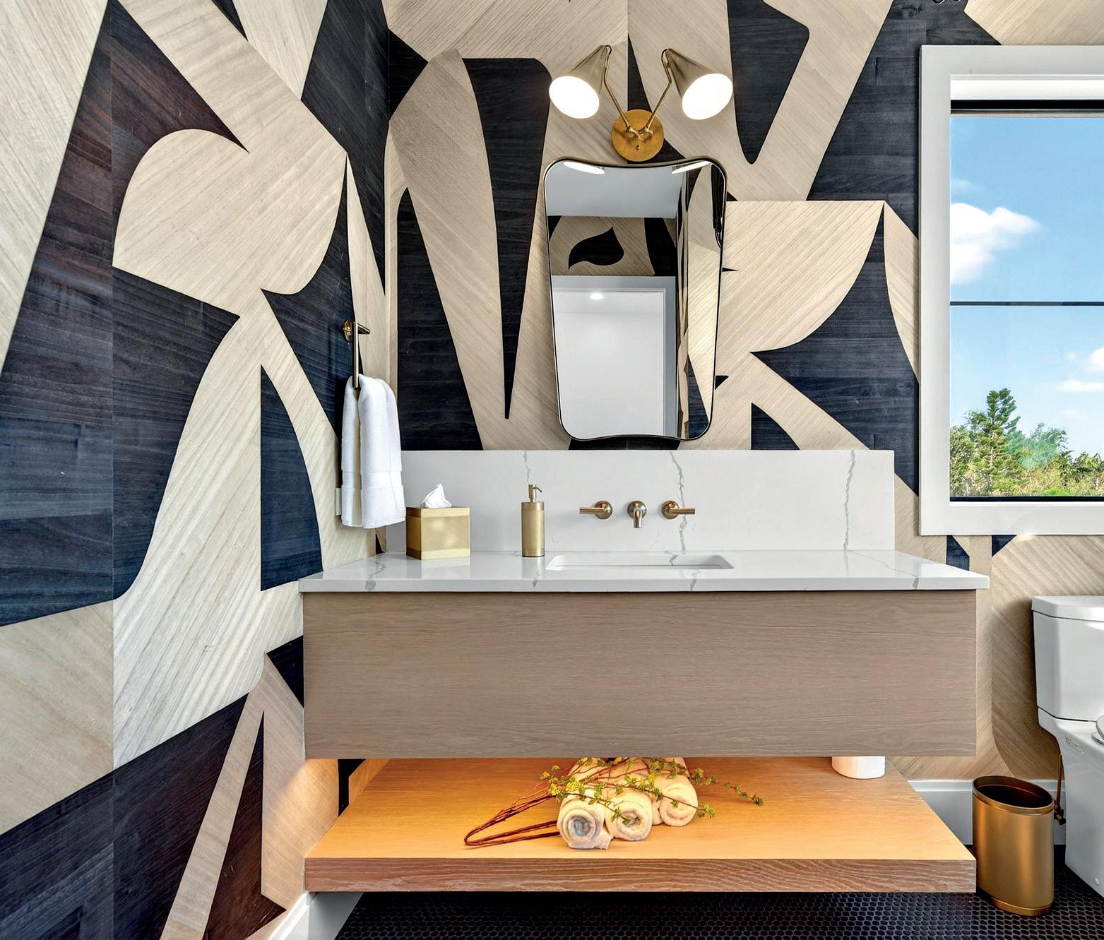 Siesta Sanctuary is a collection of three thoughtfully cra ed bathroom environments connected through a shared design language of natural materiality, refined geometry and calm coastal-inspired warmth. Custom cabinetry is featured throughout, with ri -cut white oak serving as the unifying element across all spaces. The primary bathroom showcases ri -cut white oak cabinetry paired with floating shelves above a freestanding soaking tub. The so linear grain of the oak introduces quiet movement, while the floating shelving visually extends the cabinetry and keeps the room feeling open and serene. The result is a spa-like and organic environment defined by balance and simplicity. The second bathroom takes a more architectural approach. Here, the vanity is angled into a triangular form, with a split detail separating two traditional cabinet sections. This sculptural geometry transforms the vanity into a true design feature, offering unexpected visual interest while maintaining full functionality. It demonstrates how cabinetry can influence both aesthetic character and spatial flow. The third space is an elegant powder room anchored by a floating ri -cut white oak vanity with integrated lighting. The illumination creates a so glow that highlights the natural wood grain and gives the vanity a light contemporary presence. As a guest-facing space, it delivers a memorable yet understated design moment. Across all three rooms, frameless cabinet construction ensures clean lines and precise detailing. The emphasis remains on proportion, texture and cra smanship rather than embellishment. Siesta Sanctuary reflects a philosophy of quiet luxury, where thoughtful cabinetry design enhances everyday experience and brings warmth and tranquility into the home.