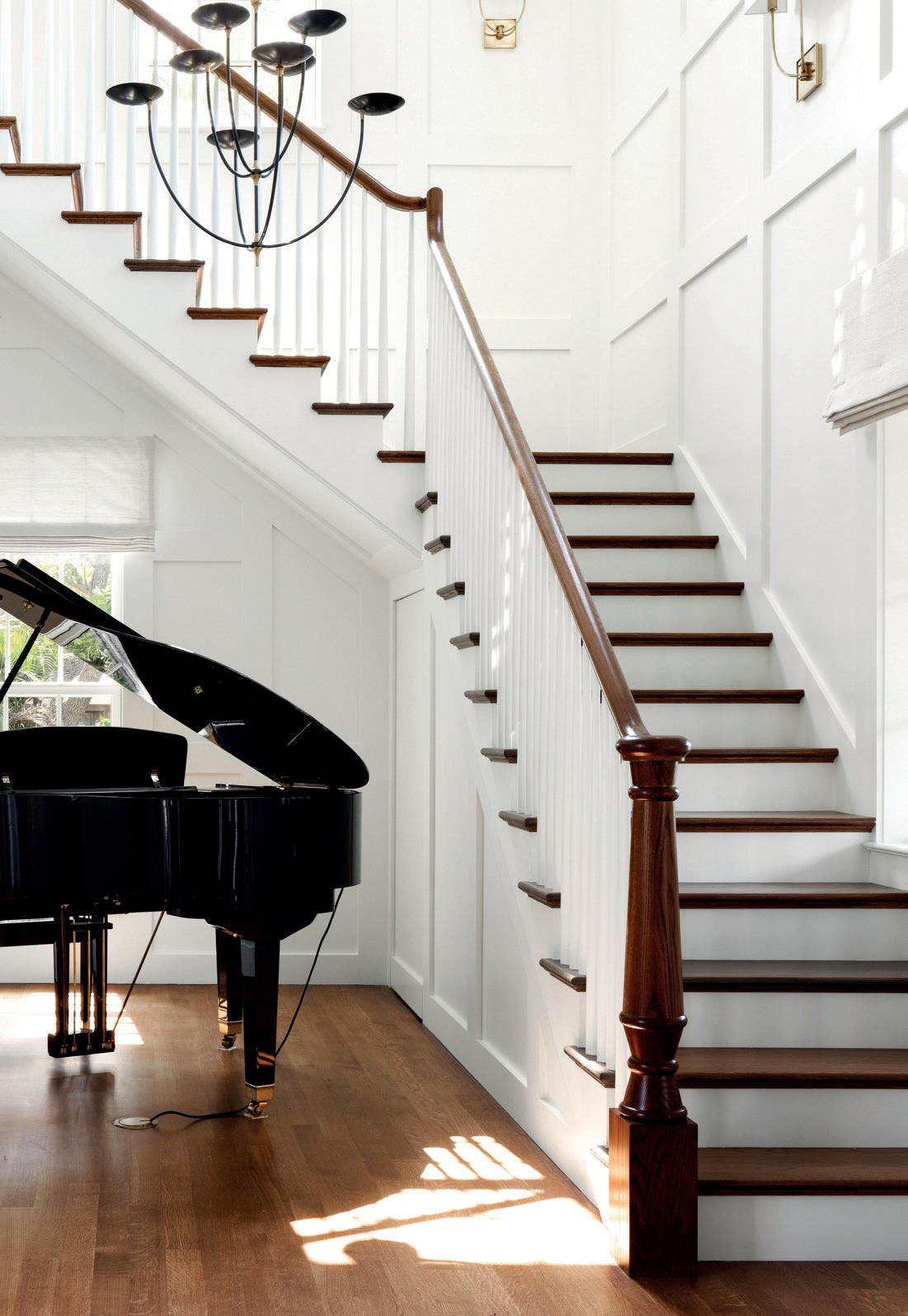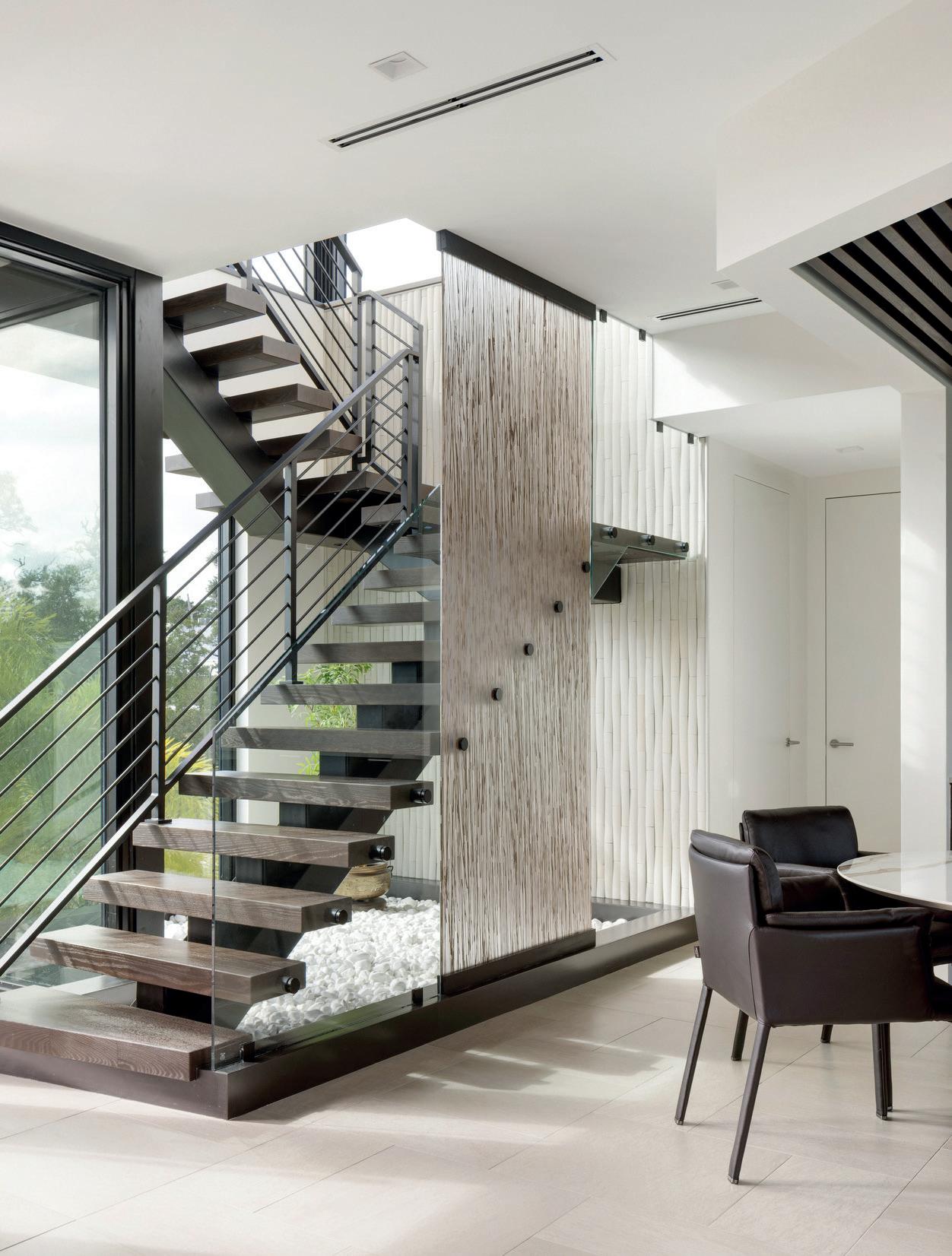 The goal in designing this 5,180 sq. . Sarasota Bay home for a retired couple and their two children was to create interiors that feel light, modern and deeply connected to water on two sides. The design emphasizes simple straightforward silhoue es, organic shapes, quiet fabrications and functionality. The pale e features an array of whites and neutrals for a relaxed yet elegant finish, paired with wood grains and natural materials that frame both the views and the activity within. Expansive sliding doors dissolve the boundary between indoors and outdoors, extending living spaces onto terraces and the elevated pool deck. Breezes, reflections and natural light become part of the interior experience. Continuous light wood flooring flows throughout to unify spaces and add warmth, while high ceilings and open-concept rooms amplify daylight and spatial clarity. The interior design is intentionally gallery-like, using white planes, refined lighting and deliberate restraint to elevate the owners’ art collection. Every piece holds significance, whether painted by a friend, created by an artist from their hometown or made by a member of the family. A custom three-level staircase celebrates the daily journey from ground level to the uppermost floor. Floating wood steps with glass railings form a sculptural centerpiece that unites the levels without interrupting views. In the kitchen, marble countertops introduce refined texture within a restrained pale e that enhances rather than competes with the proximity to the water. Unique hanging lights add modern drama and vertical emphasis while preserving the minimalist aesthetic. The resulting interior is serene, elegant and timeless. Spaces feel expansive yet calm. The home elevates everyday comfort and sets the stage for memorable entertaining while celebrating the surrounding water at every turn.