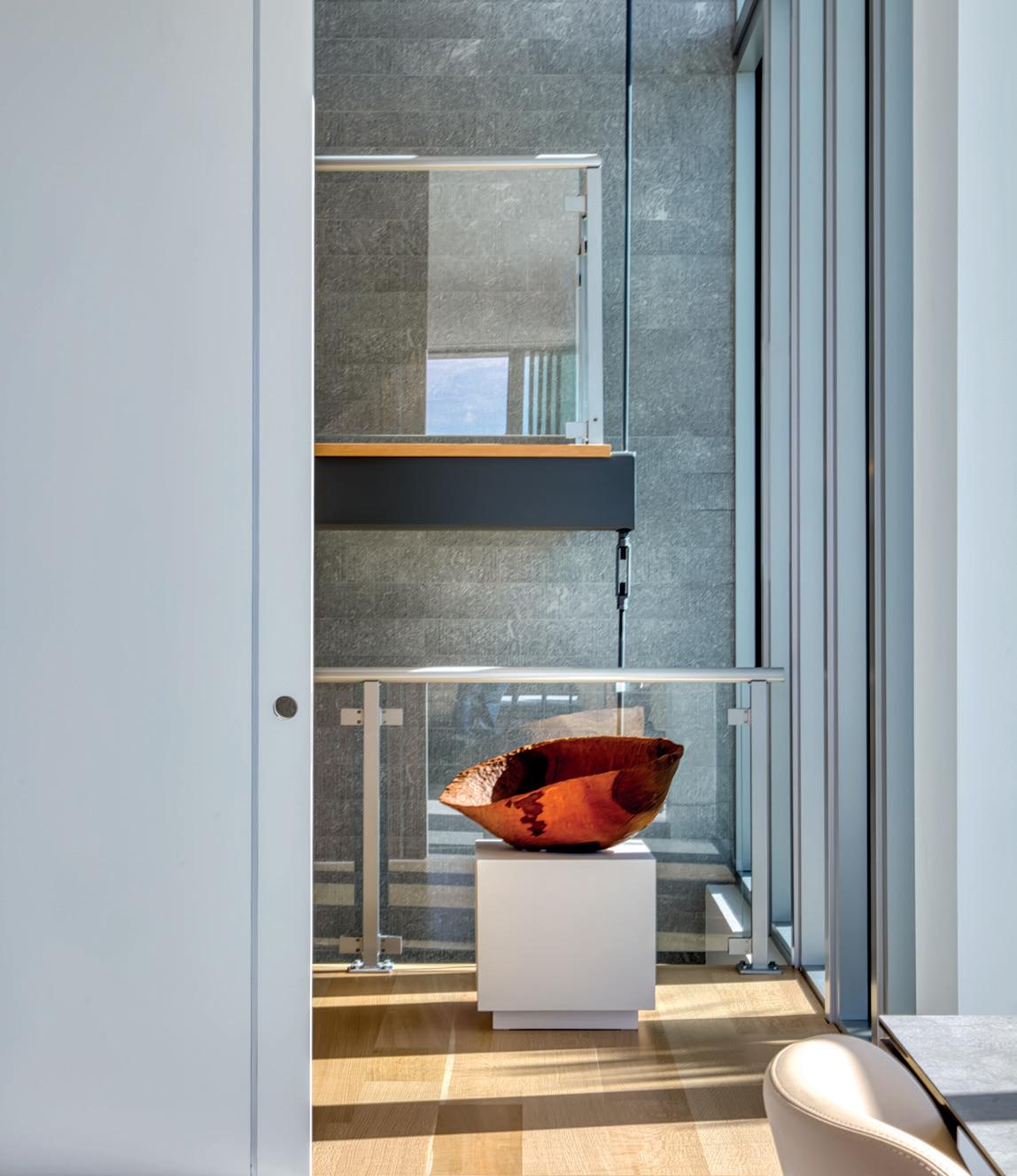 This kitchen and bar area blends conversational seating, cooking locations, a wet bar, streamlined handrail tracks and earthy colors, forming the foundation of the home’s first-floor centerpiece. The design intent was to create a calm monolithic composition that integrates extensive functionality while remaining visually restrained. A primary challenge was maintaining long flowing lines without sacrificing function. The handrail system allowed for the removal of most handles, while continuous cabinet runs guide the eye throughout the space. Equally critical was preserving fluid circulation between cooking, dining and entertaining zones while maintaining long sightlines and a unified spatial experience. Tall cabinetry is treated as an architectural backdrop rather than furniture, allowing appliances and storage to disappear into uninterrupted planes. Textured taupe surfaces are paired with deep charcoal accents below to introduce contrast and depth while grounding the island and avoiding visual noise. Functionality is organized around two distinct zones within the island. The primary area supports preparation, cooking and daily tasks, while the island’s extension encourages socialized seating and togetherness. This approach enables simultaneous use, improves workflow and reinforces the kitchen’s role as a social anchor within the home. Integrated seating further blurs the boundary between the kitchen, living space and the outdoor area beyond the glass. Innovation is expressed through layered detailing and moments of intentional relief. Open metal shelving introduces lightness and display while maintaining architectural rigor. A recessed niche creates spatial depth and a focal point highlighted by an earthy sculpture, breaking the mass of cabinetry without disrupting continuity. Carefully integrated lighting emphasizes geometry, texture and material transitions throughout the day and evening.