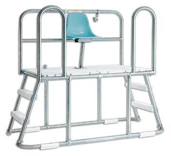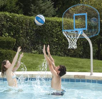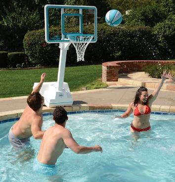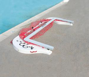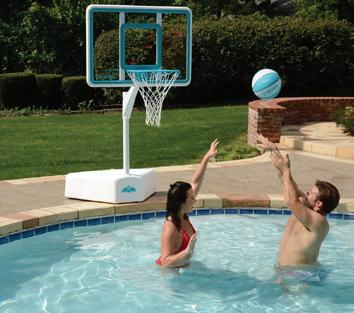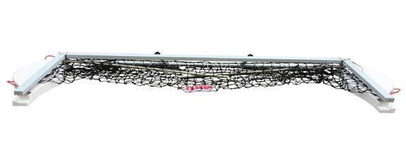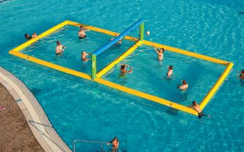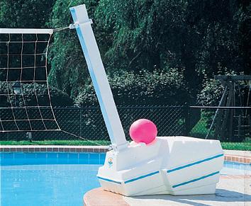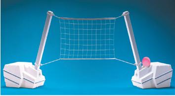 This commercial size pool volleyball set includes 2 heavy duty aluminum posts, 32' net with 40' extension rope and colored ball. Molded poly bases weigh 500 lbs. each when filled with water. Easy to set up and no tools are required. Great for salt system pools.