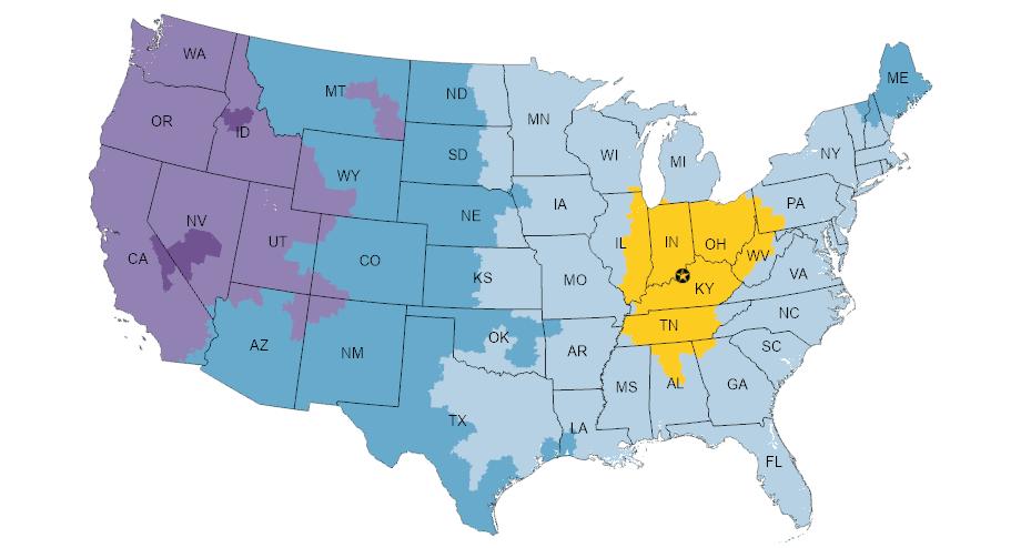 This map illustrates service schedules in business days as of January, 2026 for FedEx Ground shipments. For the latest transit information, go to <fedex.com/ grd/maps> and enter the Origin/Postal code of 40213 or 91761. FedEx Ground business days are Monday through Friday (excluding holidays). FedEx Home Delivery business days are Tuesday through Saturday (Excluding Holidays).