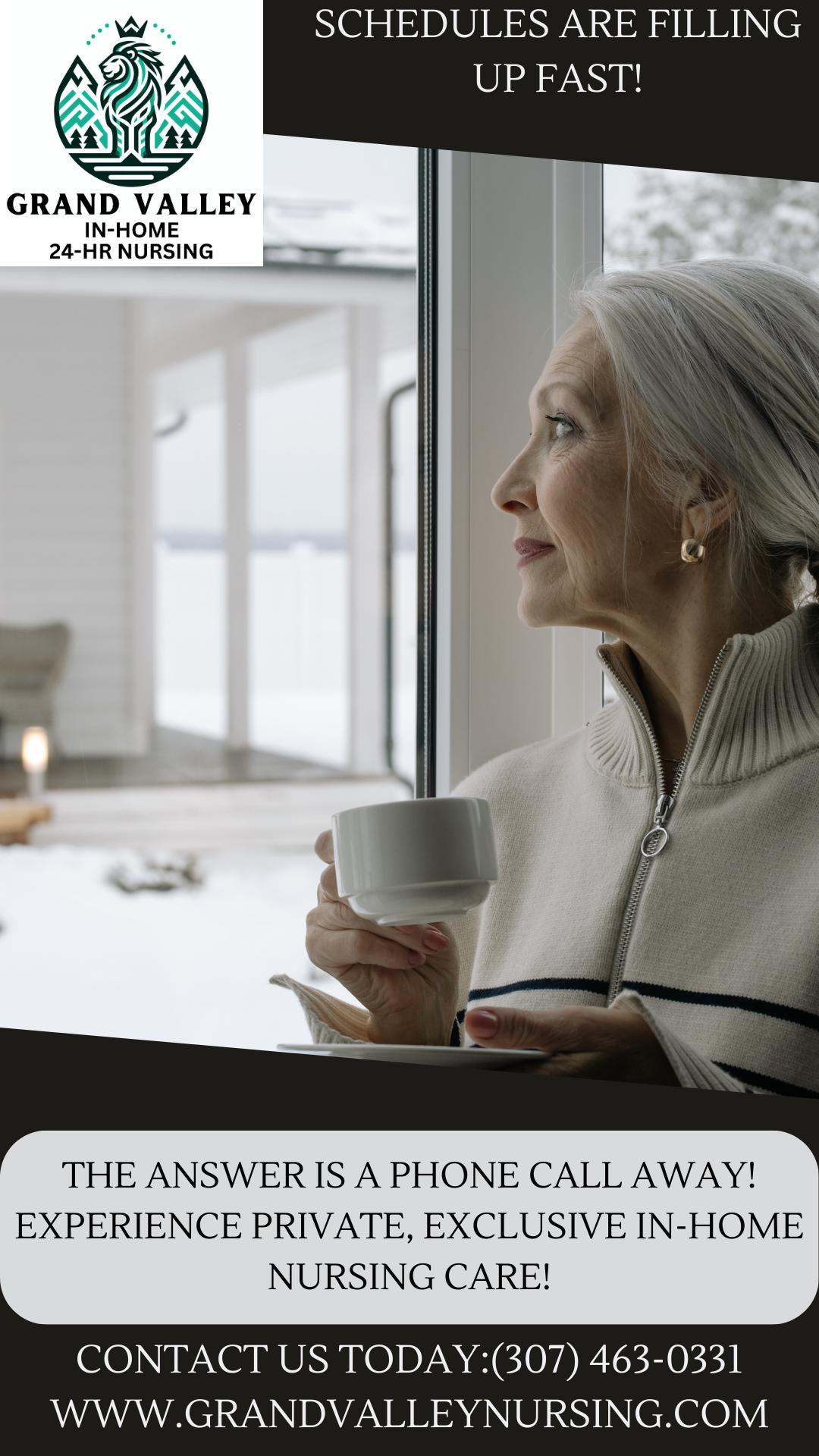 Grand Valley Nursing is the superior alternative to long-term care by transforming home health! Grand Valley Nursing specializes in 24 hour, 7 days a week in-home care tailored to meet all your needs. If you would like to stay in the comfort of your own home and receive top-of-the-line care call us! (307) 463-0331 • grandvalleynursing.com
