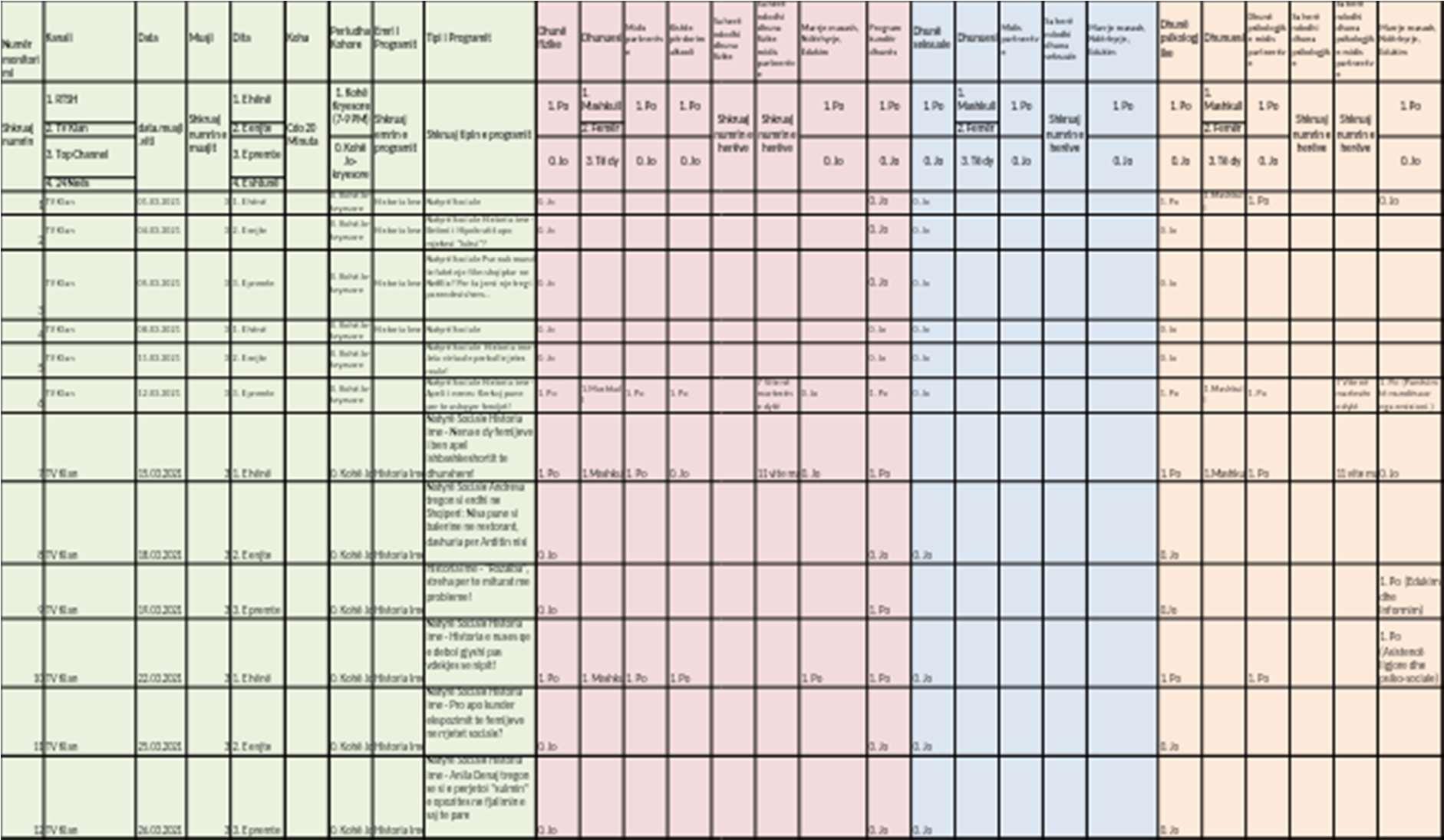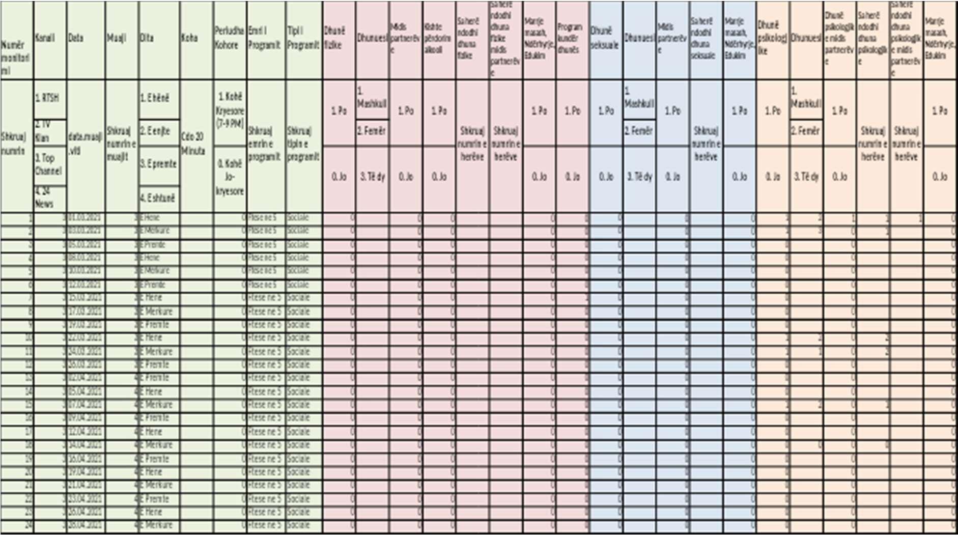 Monitoring was conducted over four months (March, April, May, June). Television programs and news editions were monitored for the four main televisions in the country: Top Channel, Klan, RTSH and News 24. The selection of televisions was basedonseveralcriteria.TVKLANandTOPCHANNELbecamesubjecttomonitoring due to their high viewership and the status they hold as national televisions. Radio Televizioni Shqiptar (RTSH) - as the only public television and News 24 to have a visual media with a profile dedicated to information in the list.