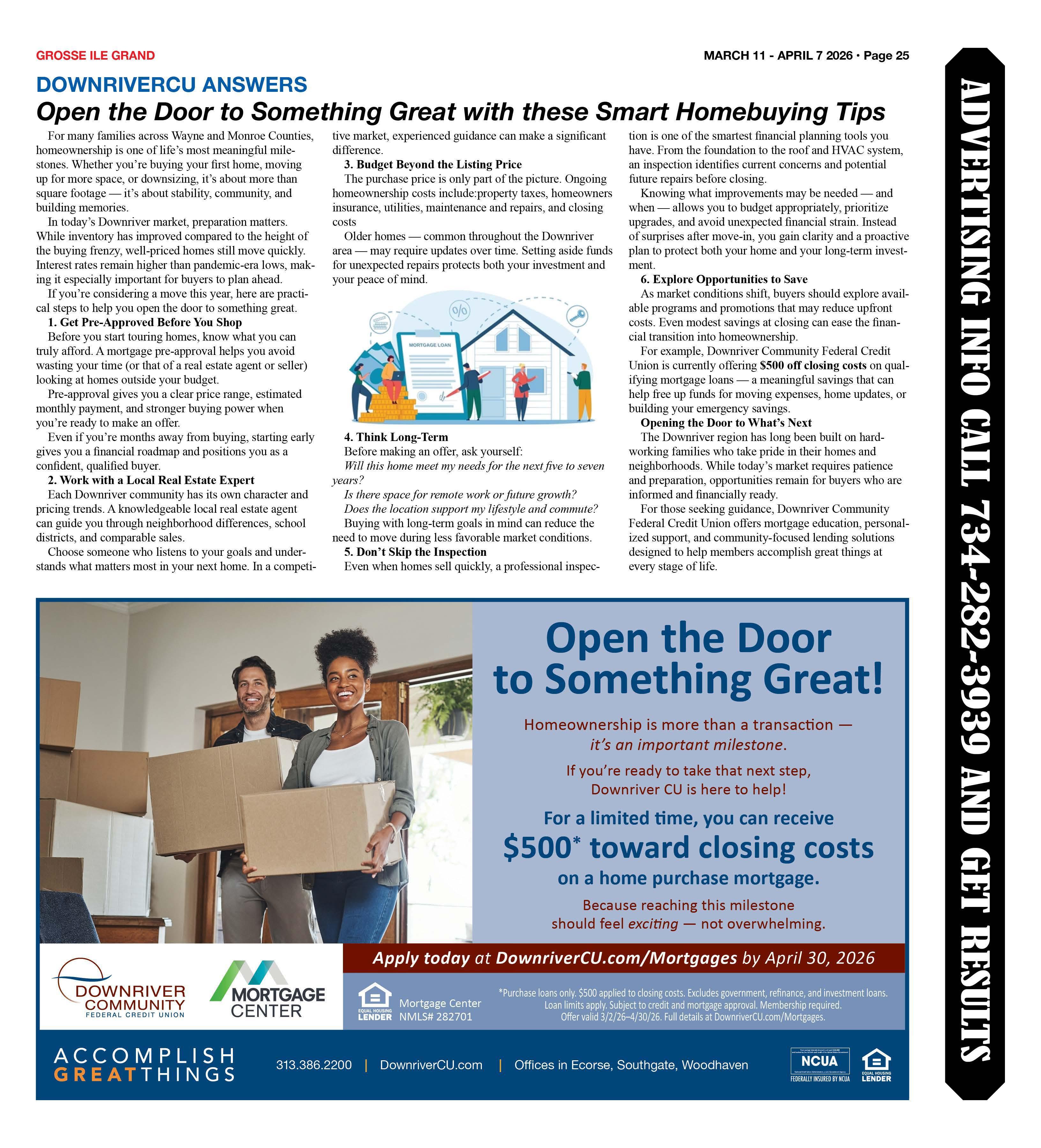 For example, Downriver Community Federal Credit Union is currently offering $500 off closing costs on qualifying mortgage loans - a meaningful savings that can help free up funds for moving expenses, home updates, or building your emergency savings.
