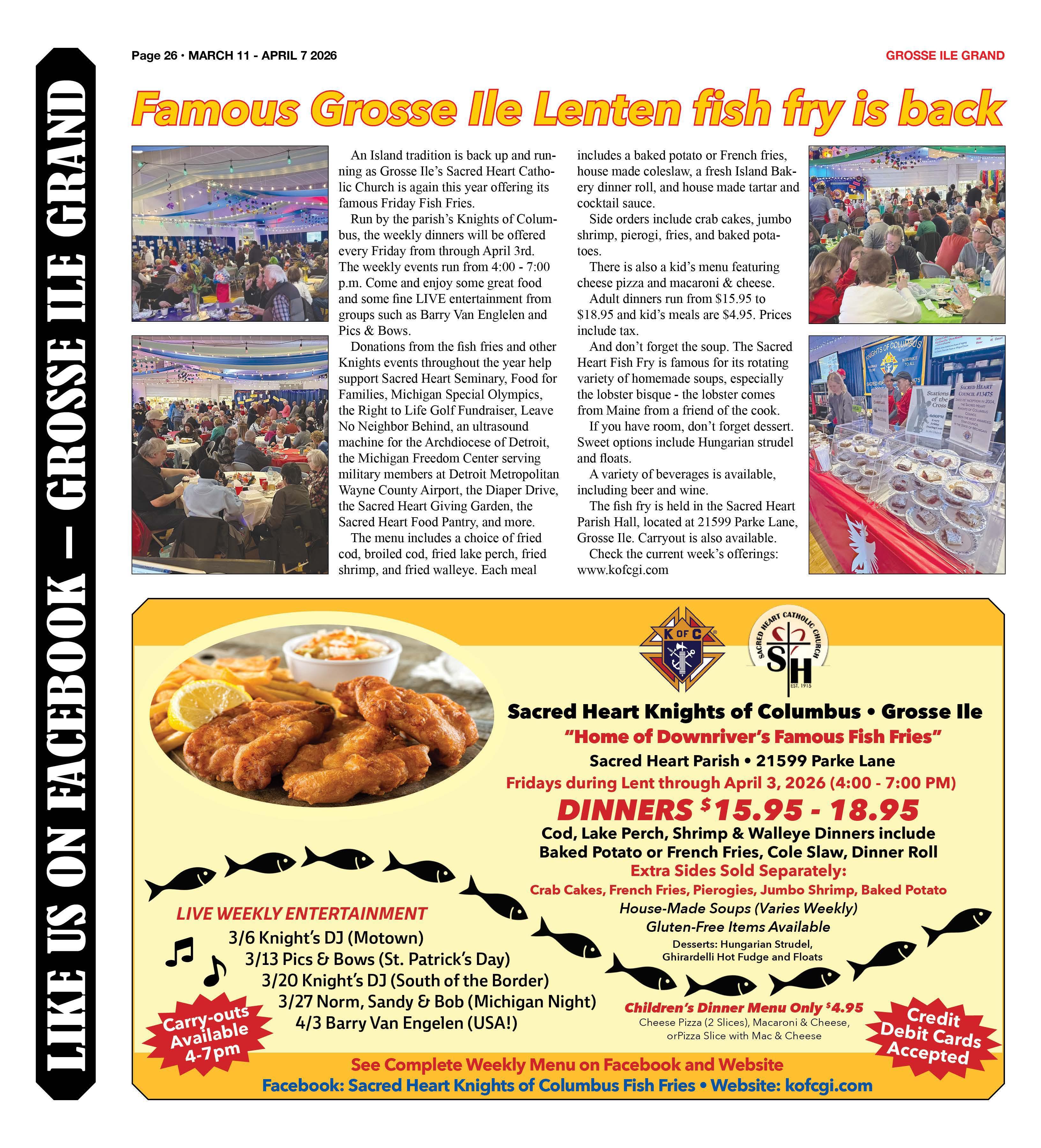 The fish fry is held in the Sacred Heart Parish Hall, located at 21599 Parke Lane, Grosse Ile. Carryout is also available.