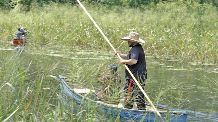 Kevin Harris of the Nottawaseppi Huron Band of the Potawatomi push poling during wild rice gathering. Photo courtesy of Nottawaseppi Huron Band of the Potawatomi