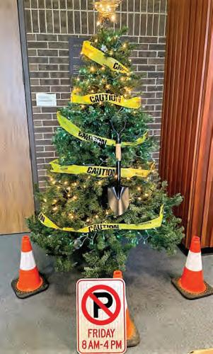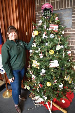 A couple trees are a patriotic red, white and blue. The Fire Department tree is topped off by a red firefighter’s helmet. The Downtown Development Authority tree features ornaments containing the logos of a number of businesses in town. The Department of Public Services tree includes police tape, orange cones and a no-parking sign. The Parks and Recreation tree is topped by a hockey helmet, has hockey sticks on the bottom and is covered with sports-related ornaments. And so on.
