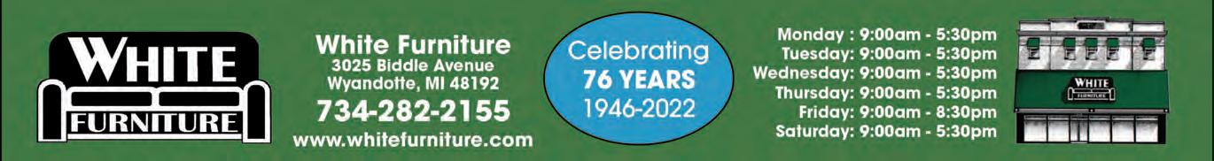 Page 28 • December 13, 2022 — January 12, 2023 • SOUTHGATE STAR Have an Event or Fundraiser? Let us know at 734-282-3939 Free 2 Year Lay-A-Way Down payment and monthly payments required. 18 Months Interest Free With credit approval by Wells Fargo. Monthly payments required. Special orders require a deposit. See store for full details. FREE DELIVERY! Free delivery with a minimum $299 purchase delivered within 20 miles Sofa with moveable chaise $779 Wooden Rocker $249 Set of 4 TV Tables $119 Made in the USA. Lifetime warranty frame, seat springs and reclining mechanisms. Twin Bed, Dresser, Mirror & Chest $999 W H I T E F U R N I T U R E ’ S Small scale wall hugger recliner $499 Presidential Suite Firm or Plush DOUBLE-SIDED MATTRESS Twin $699 - Full $799 - Queen $899 - King $999 • Fire Shield® Fiber • Gentle Support™ Aire • Gentle Support™ Foam • Hi IFD Foam Topper • Gel Ac-tive® Gel Memory Foam • Gel Active® Gel Foam 800 Continuous Coil System with Foam Encase-ment • Serta® Support Foam • 10 year warranty I-Comfort Limited Edition Mattress 10 year warranty Queen $999 • King $1299 Serta Adjustable Base Queen $699 Serta Adjustable Base King $899 TempActiv Gel Memory Foam EverCool® Fuze Gel Memory Foam Serta® Ultimate Edge® Foam Support Core Brown Leather Recliner In stock as wall hugger or rocker recliner $799 m • 99 9