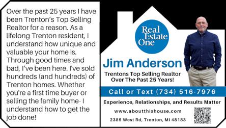Trenton DDA kicks projects into high gear 21645 Allen Rd. Woodhaven, MI. 48183 Metro.HelpUSell.com With the Help-U-Sell concept, you could save thousands of dollars when you sell your home. Want to know more? Give us a call. (734) 362-1111 A BETTER WAY TO SELL 6% Don’t Pay Too Much to Sell Your Home! PARTHENON CONEY ISLAND 17064 Fort Street Riverview 734.285.5900 Mon-Sat: 6am-10pm Sun: 7am-9pm • Salmon • Tilapia • Perch • Battered Cod • Shrimp • Crab Cake All with Vegetable Options & RESTAURANT www.parthenonconeyisland.com LENT SPECIALS Where You’re Never Just a File Number Joe Migliaccio (734) 341-4322 For a Fast Quote & Quality Service, Call Joe! NMLS: #940908 COMPANY NMLS: #129386 www.joemigs.com 21643 Allen Rd, Woodhaven RITA COLE Agent 8146 Macomb St. Grosse Ile, MI 48138-1574 Bus: 734-675-6870 Fax: 734-675-0492 rita@ritacole.com The greatest compliment you can give is a referral.