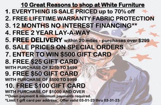 TRENTON TIMES • March 23 – April 25, 2023 • Page 35 Like Us On Facebook : TRENTON TIMES NEWS WHITE FURNITURE’S Monday: 9:00am - 5:30pm Tuesday: 9:00am - 5:30pm Wednesday: 9:00am - 5:30pm Thursday: 9:00am - 5:30pm Friday: 9:00am - 8:30pm Saturday: 9:00am - 5:30pm White Furniture 3025 Biddle Avenue Wyandotte, MI 48192 734-282-2155 www.whitefurniture.com www.facebook.com/whitefurniture Solid Wood Dropleaf Table & 2 Chairs $369 Solid Wood Table & 4 chairs $1899 42” x 60” table with a self storing leaf. In stock for immediate free local delivery. Dresser, Mirror, Chest & Bed $2999 Reclining Sofa Sale Price $899 Reclining Chair Sale Price $599 Free local delivery