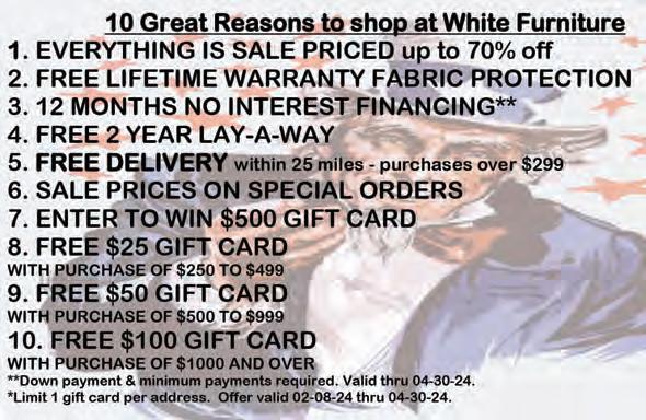Page 24 > April 25 - May 22, 2024 > WYANDOTTE WARRIOR Have an Event or Fundraiser? Let us know at 734-282-3939 Monday: 9:00am - 5:30pm Tuesday: 9:00am - 5:30pm Wednesday: 9:00am - 5:30pm Thursday: 9:00am - 5:30pm Friday: 9:00am - 8:30pm Saturday: 9:00am - 5:30pm White Furniture 3025 Biddle Avenue Wyandotte, MI 48192 734-282-2155 www.whitefurniture.com www.facebook.com/whitefurniture Best Wall Hugger Recliner $499 Available in several colors Available as a rocker recliner Made in the USA Best Leather Rocker Recliner $799 Available in several colors Available as a rocker recliner Made in the USA Palace Firm Mattress 15 year warranty Twin $349 - Full $499 Queen $599 - King $749 Olympic helical14-gauge coils. Two sided mattress for twice the durability. Soy based eco friendly cooling foam. Serta Perfect Sleeper Mattress Twin $499 - Full $579 Queen $599 - King $799 Designed in the USA & made Downriver 825 individually wrapped coils Zoned Support—Pressure Relief 10 year warranty Twin $899 - Full $959 Queen $999 - King $1299 Wall Hugger Recliner $299 Stocked in Grey, Beige & Brown Made in the USA Flexsteel Rocker Recliner $1079 Available in 150 colors. Lifetime warranty frame, seat springs, seat cushion & reclining mechanism S E ’ R U T N R U F E T H W I I