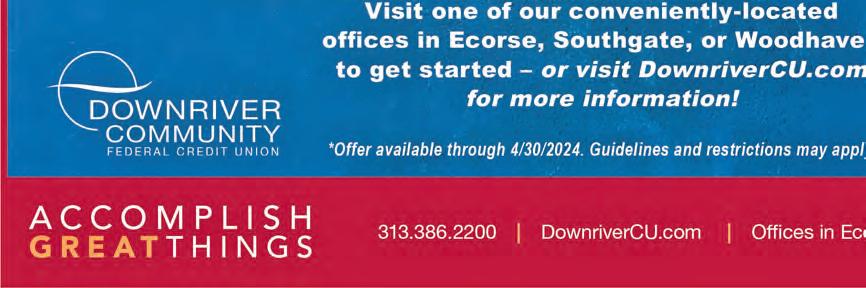 www.ForresterLawOffice.com Forrester Law Office Office 5 STAR ★ ★ ★ ★ ★ REVIEW ■ Business Law ■ Personal Injury ■ Wills & Trusts ■ Family Law ■ General Practice ■ Medical Malpractice Lunch & Dinner Specials Daily 734-285-1707 916 W. Jefferson - Trenton erson M-F 11:30 to 9 pm Sat. 3 to 9 pm Closed Sundays www.SibleyGardens.com Since 1935 Diners’ Choice Award Winner! PERFECT FOR: • Construction • Demolition • Yard Waste Removal • Household Cleanouts and More! 10, 12, 15, 20 AND 25-YARD DRIVEWAY-FRIENDLY ROLL-OFF DUMPSTERS WolverineDumpsterRental.com 63 Mill St., Ecorse, MI 48229 Contractors/Residential Clients, We Bring Our Dumpster to You! Let Wolverine Make Your Cleanup Easier! MEDICARE? OPEN ENROLLMENT IS NOW 313-999-4551/4550 Call today to schedule a $0 cost appointment in our Southgate, MI Office or stop in at 14432 Northline Russell 313-999-4550 Kymberly 313-999-4551 We do not offer every plan available in your area. Any information we provide is limited to those plans we do offer in your area which are 86 plans offered by 12 Medicare organizations. Please contact Medicare.gov, 1–800–MEDICARE, or your local State Health Insurance Program to get information on all of your options. TURNING 65? Have Medicare questions? Already on Medicare and have questions? Your hometown experts can help! Call to see if your plan is the best for you! FREE HELP ANYTIME Review your plan changes for 2024 with us today! Immediate answers!