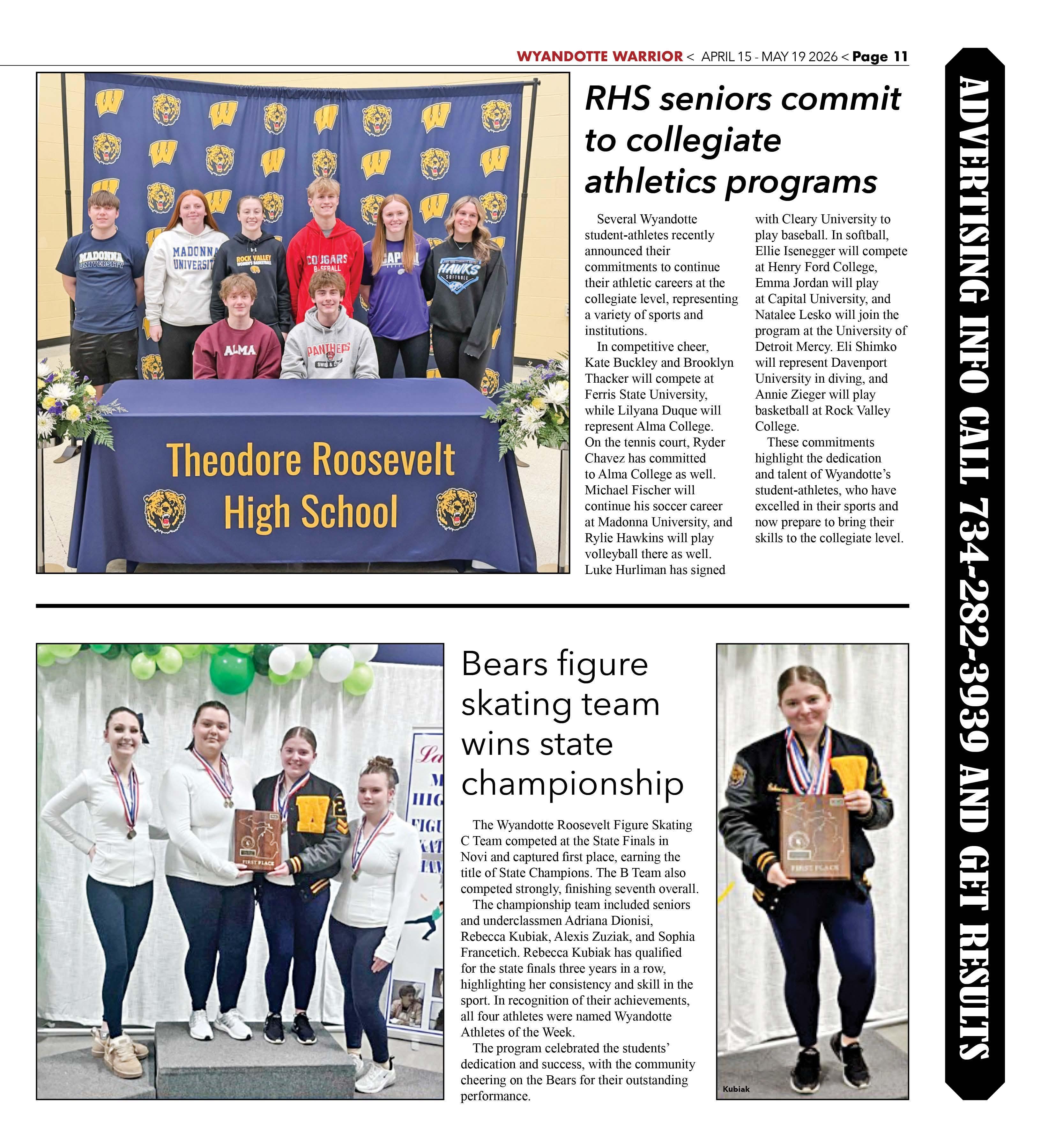The Wyandotte Roosevelt Figure Skating C Team competed at the State Finals in Novi and captured first place, earning the title of State Champions. The B Team also competed strongly, finishing seventh overall.