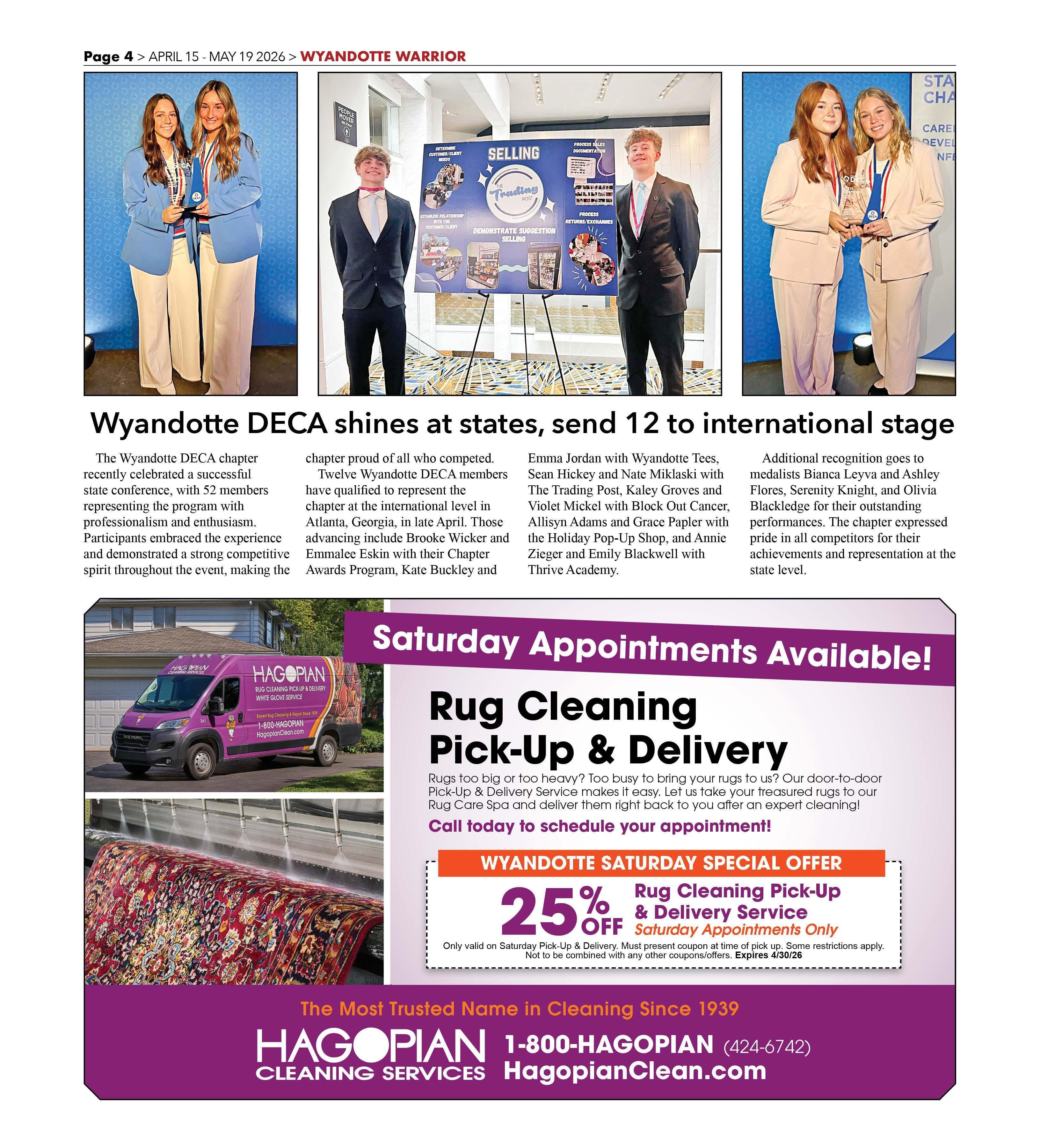 Twelve Wyandotte DECA members have qualified to represent the chapter at the international level in Atlanta, Georgia, in late April. Those advancing include Brooke Wicker and Emmalee Eskin with their Chapter Awards Program, Kate Buckley and