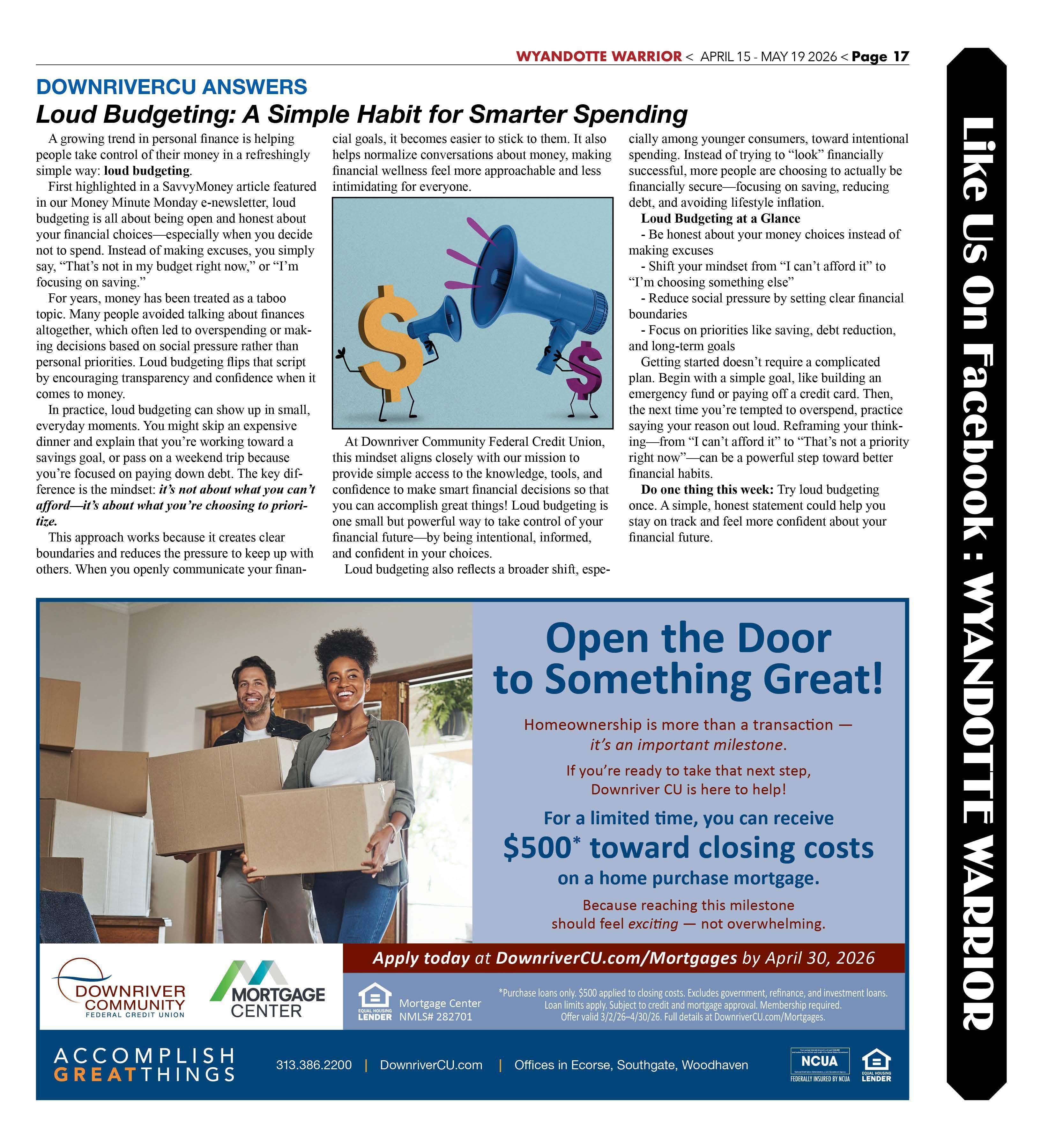 At Downriver Community Federal Credit Union, this mindset aligns closely with our mission to provide simple access to the knowledge, tools, and confidence to make smart financial decisions so that you can accomplish great things! Loud budgeting is one small but powerful way to take control of your financial future-by being intentional, informed, and confident in your choices.