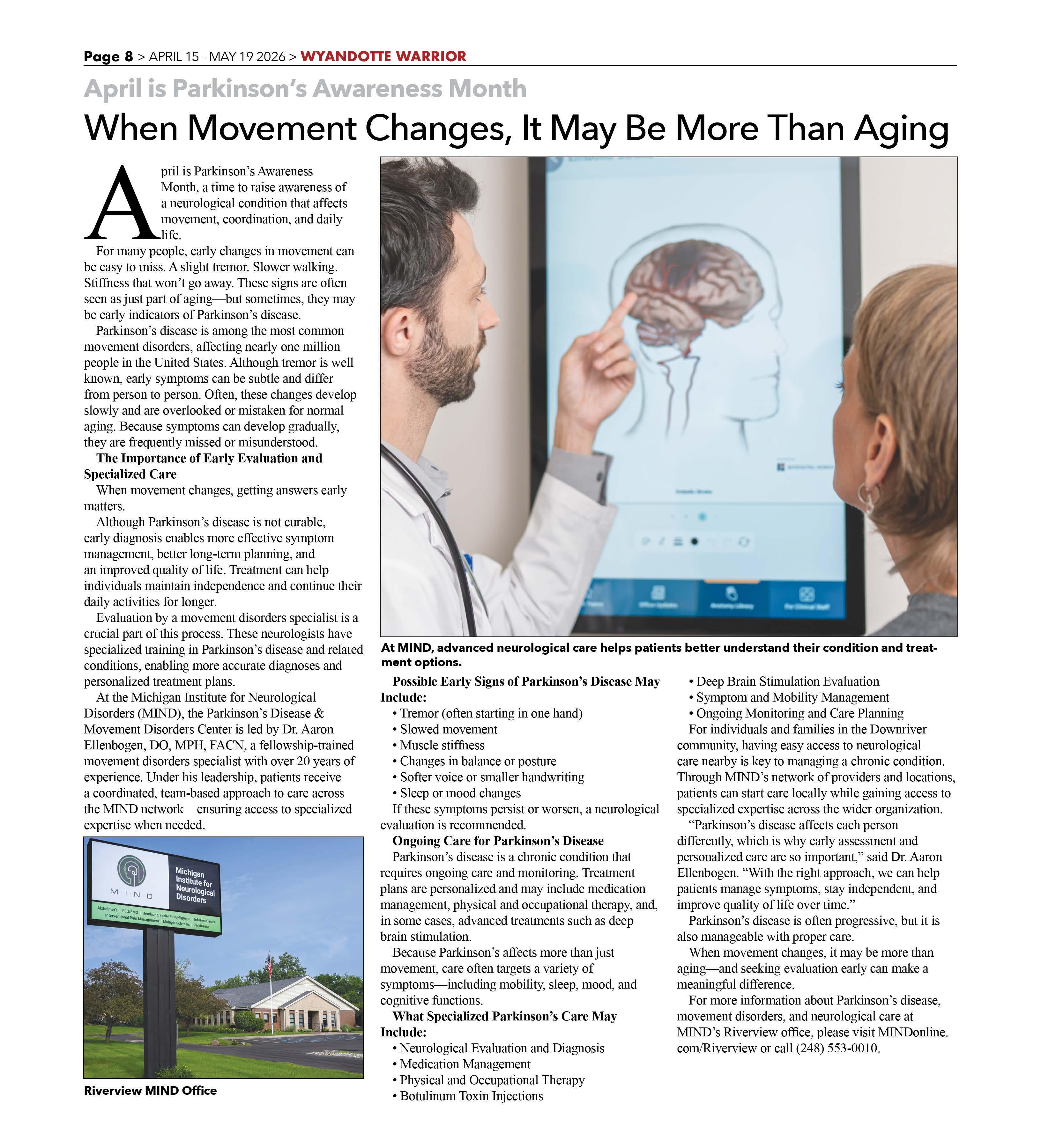 For more information about Parkinson's disease, movement disorders, and neurological care at MIND's Riverview office, please visit MINDonline. com/Riverview or call (248) 553-0010.