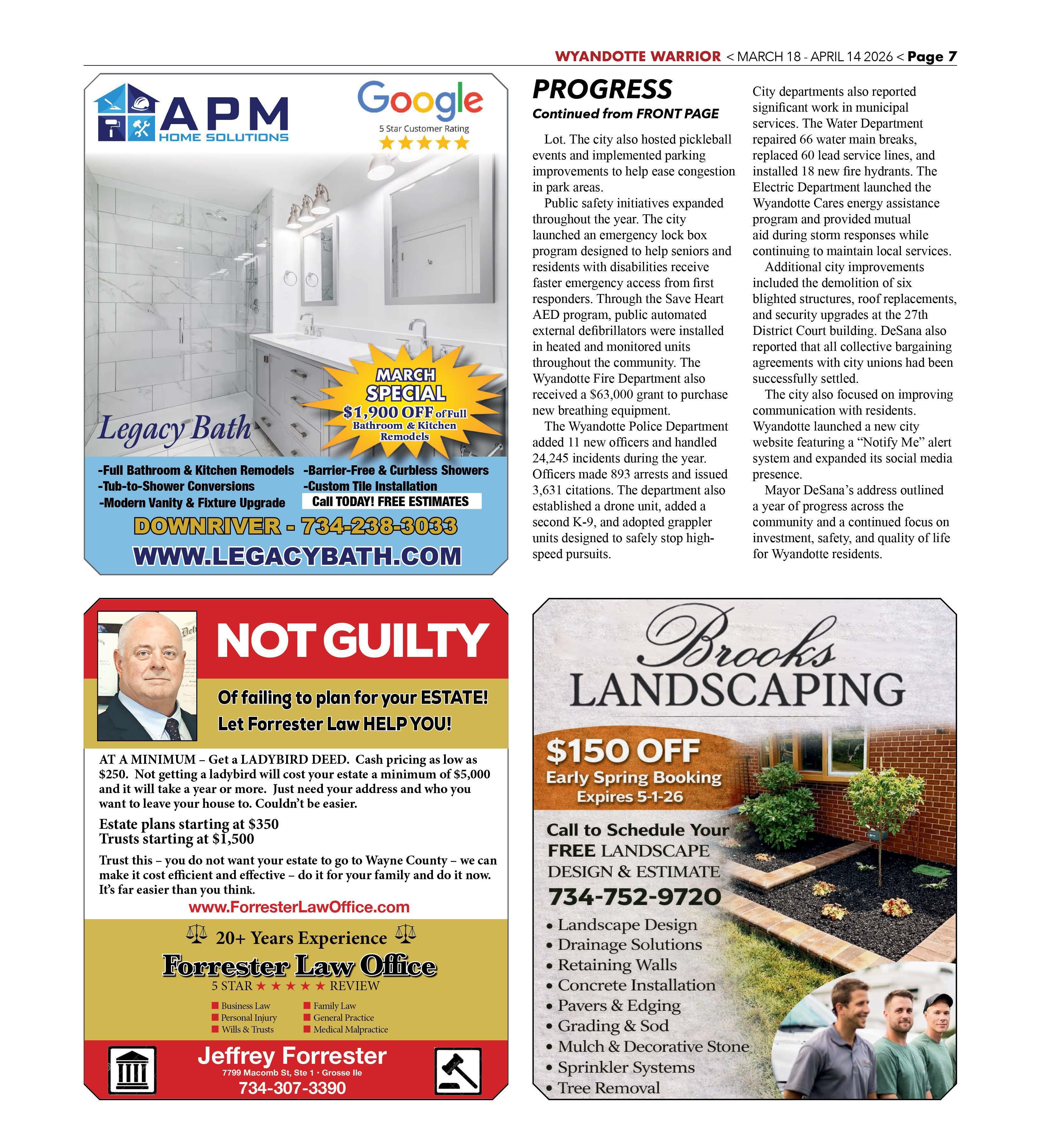 Additional city improvements included the demolition of six blighted structures, roof replacements, and security upgrades at the 27th District Court building. DeSana also reported that all collective bargaining agreements with city unions had been successfully settled.