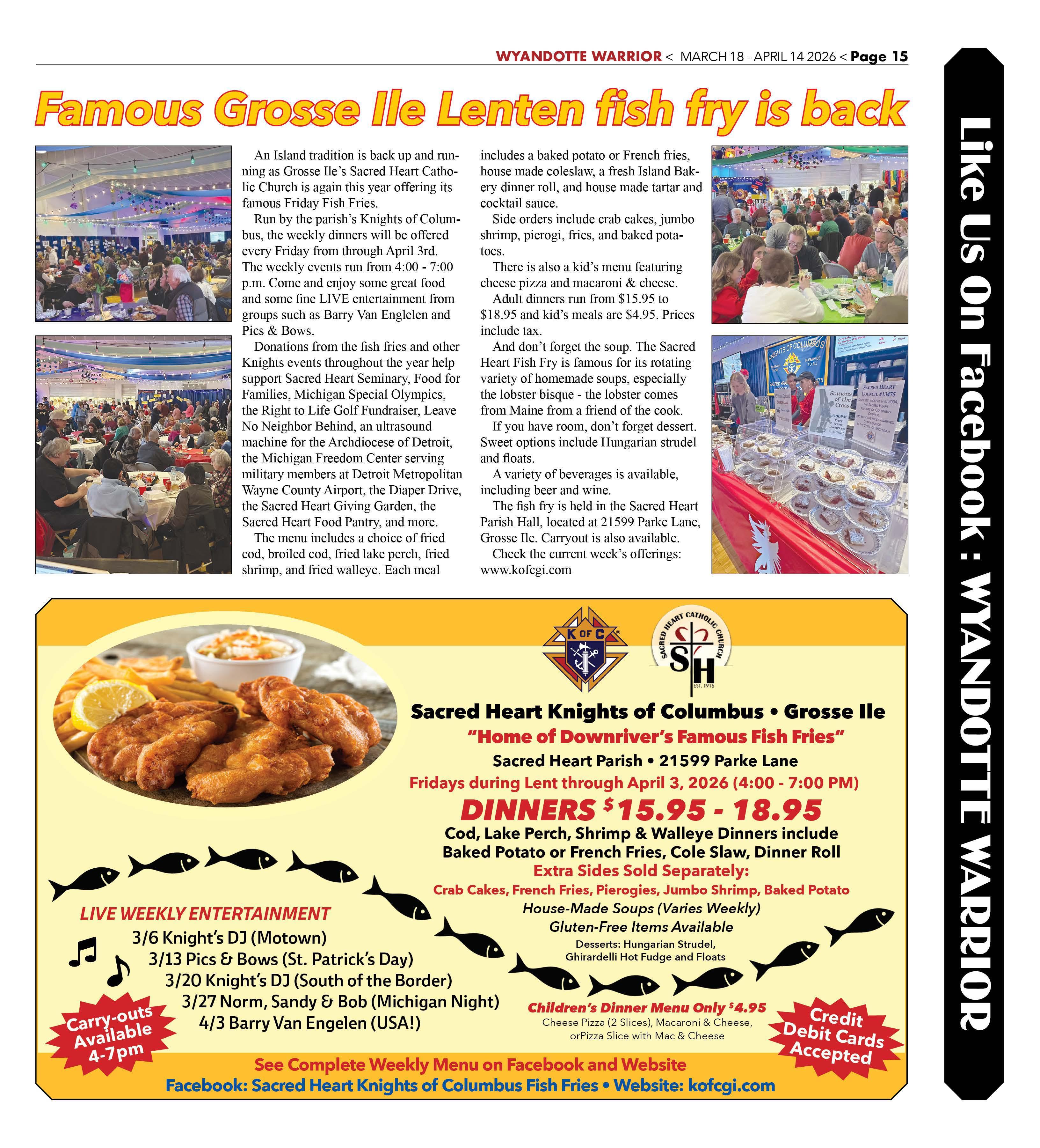The fish fry is held in the Sacred Heart Parish Hall, located at 21599 Parke Lane, Grosse Ile. Carryout is also available. Check the current week's offerings: www.kofcgi.com