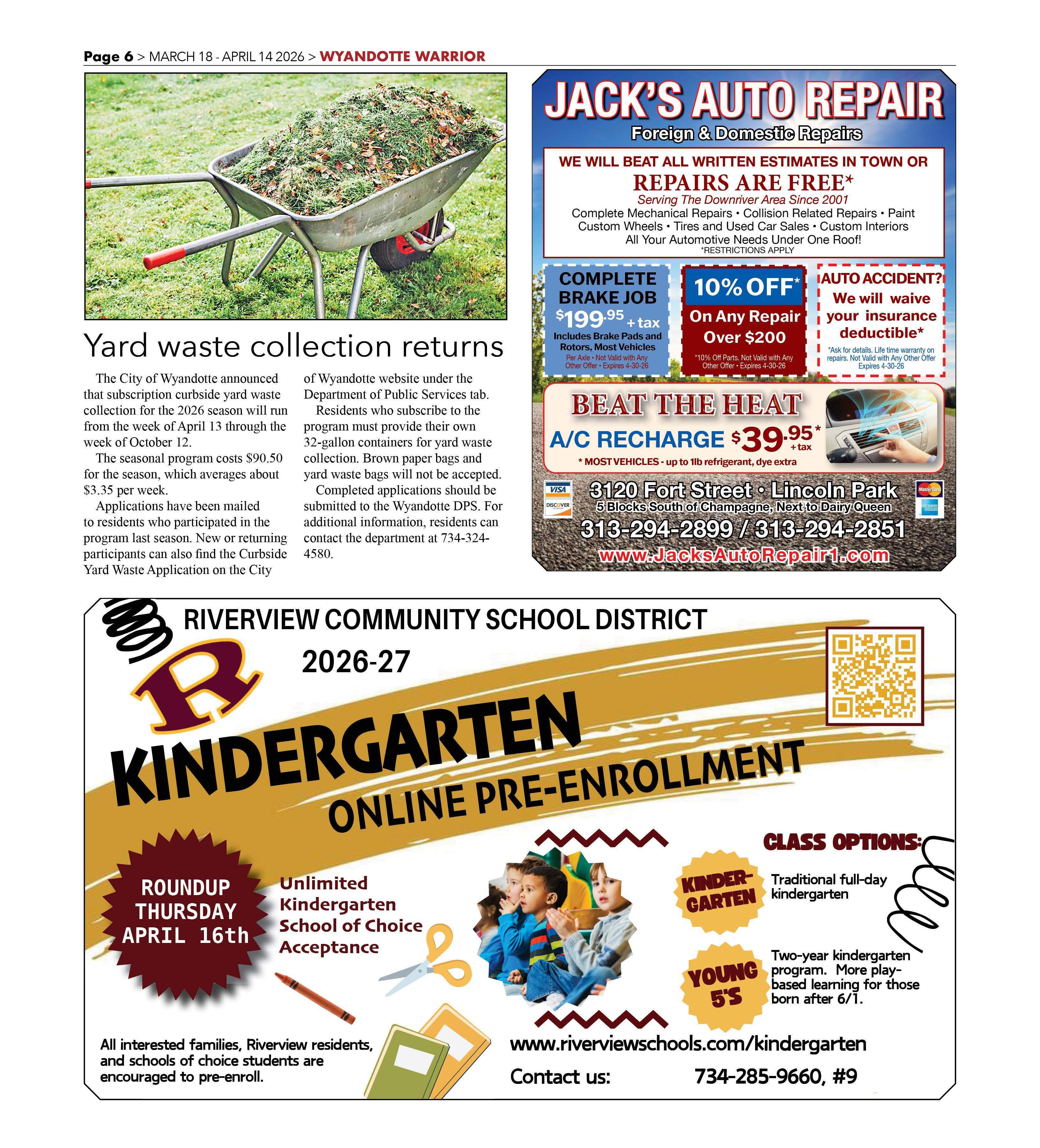 The City of Wyandotte announced that subscription curbside yard waste collection for the 2026 season will run from the week of April 13 through the week of October 12.