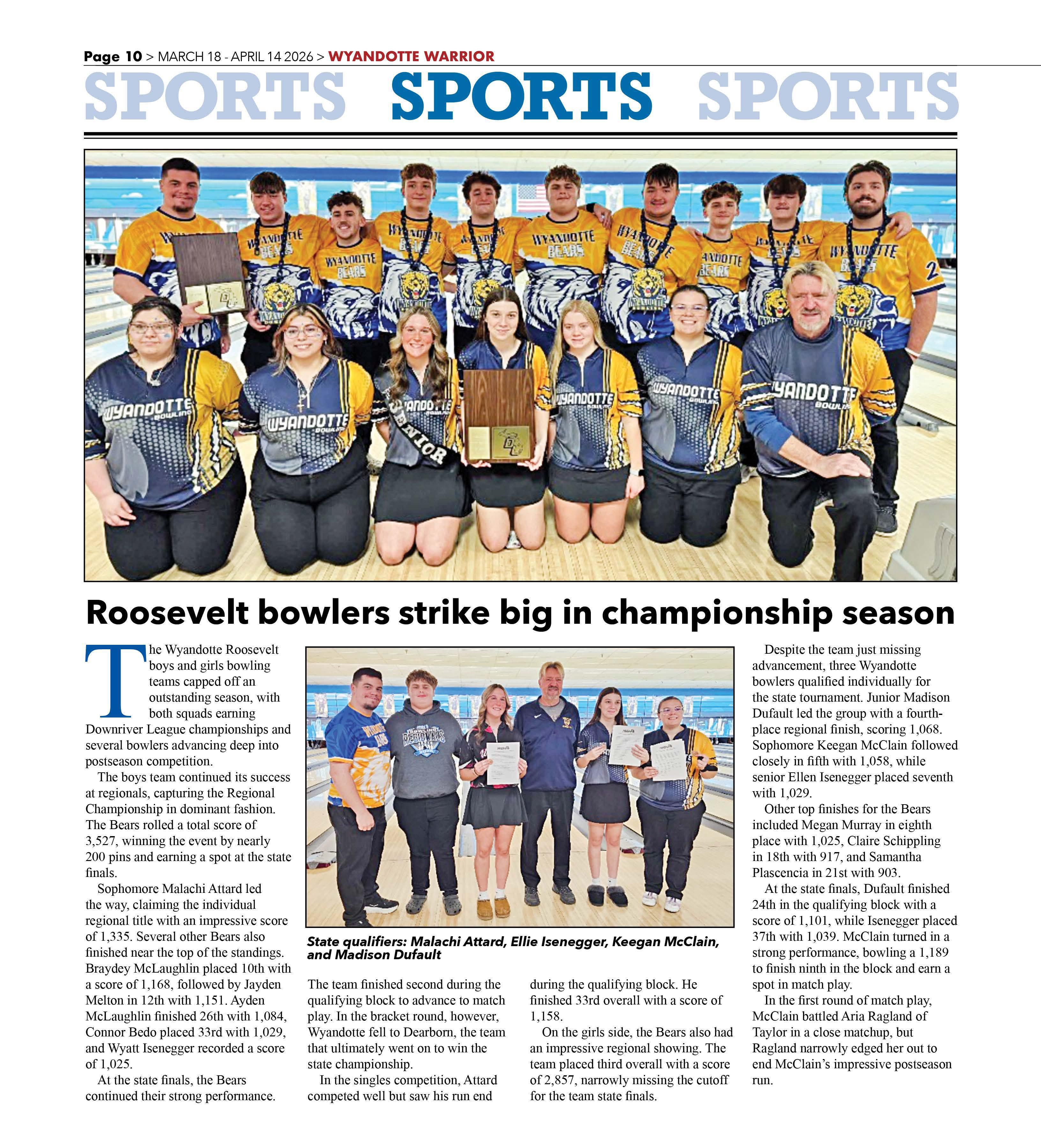 Despite the team just missing advancement, three Wyandotte bowlers qualified individually for the state tournament. Junior Madison Dufault led the group with a fourthplace regional finish, scoring 1,068. Sophomore Keegan McClain followed closely in fifth with 1,058, while senior Ellen Isenegger placed seventh with 1,029.