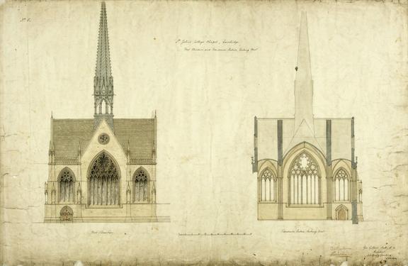 Many of us know that the Chapel at St John’s was designed by George Gilbert Scott, but probably fewer are aware that his original design featured a spire rather than a tower. A selection of beautifully executed elevations survive in the archives, allowing us to imagine how different the skyline of central Cambridge might have been