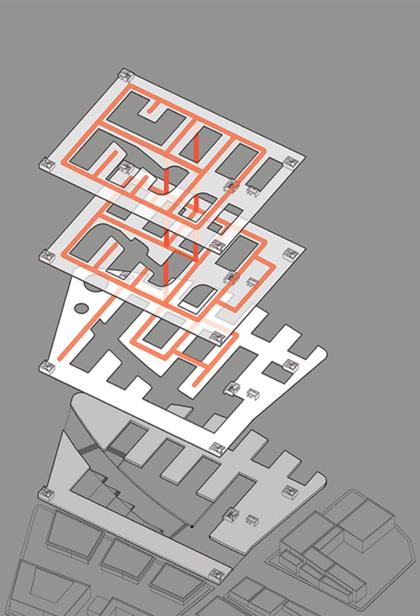 Copying this plate on the rest of the floors with the tracks of the railways, created some sort of overlapping open spaces for inmates to use.