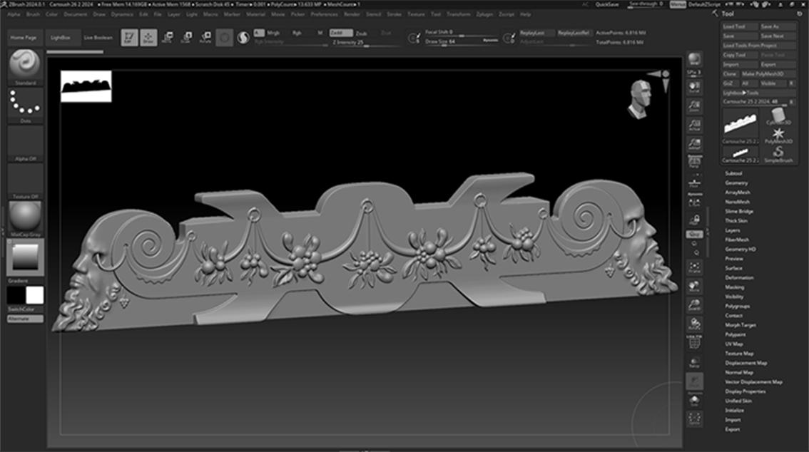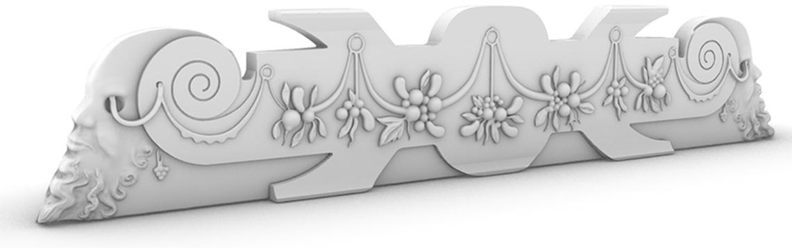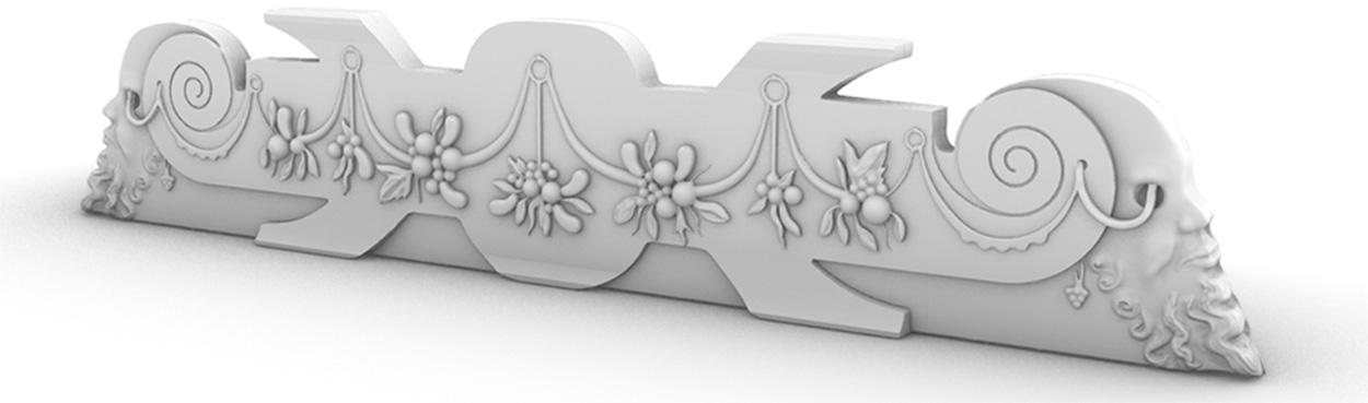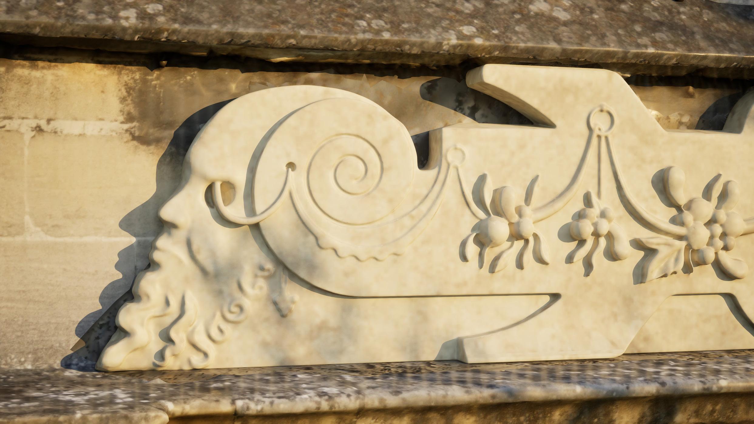 The stone carving was created with several components, each of which was grouped separately to facilitate later editing and refinements. This modular approach was essential for managing the complex details of the cartouche and ensuring each element could be individually perfected before being combined into the final piece.