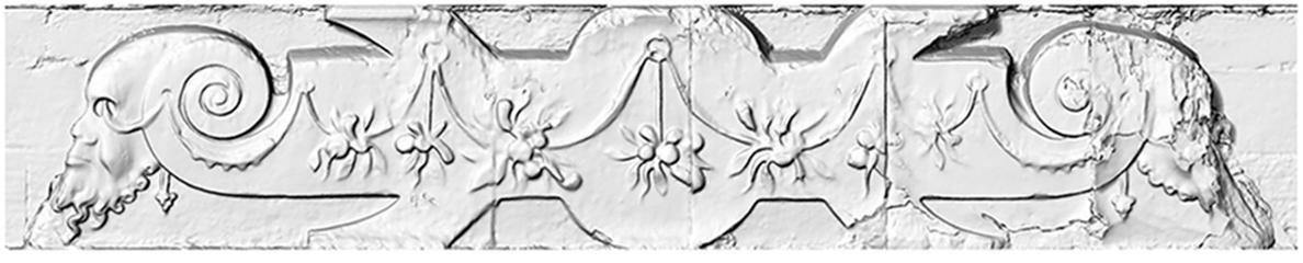 The drape with the fruits and leaves was another critical component. This element added a decorative and symbolic layer to the cartouche, reflecting the Elizabethan period’s ornamental style. Each fruit and leaf had to be individually modeled and then arranged in a flowing, naturalistic pattern that mimicked the original design. The drapes connecting the eyes to the main fruit-drape structure were particularly challenging due to their delicate and intertwined nature. These elements had to seamlessly integrate with both the facial features and the main decora-