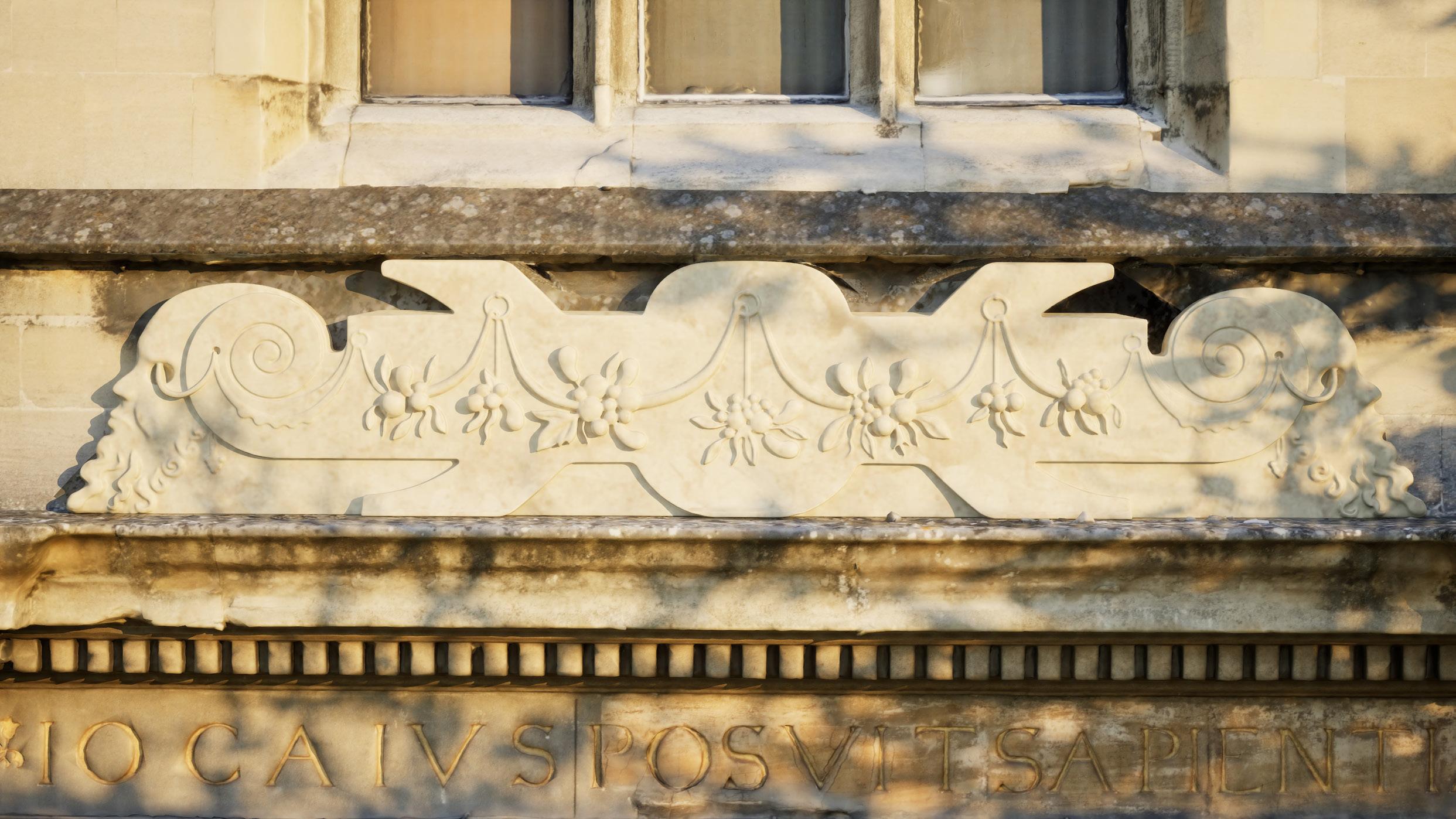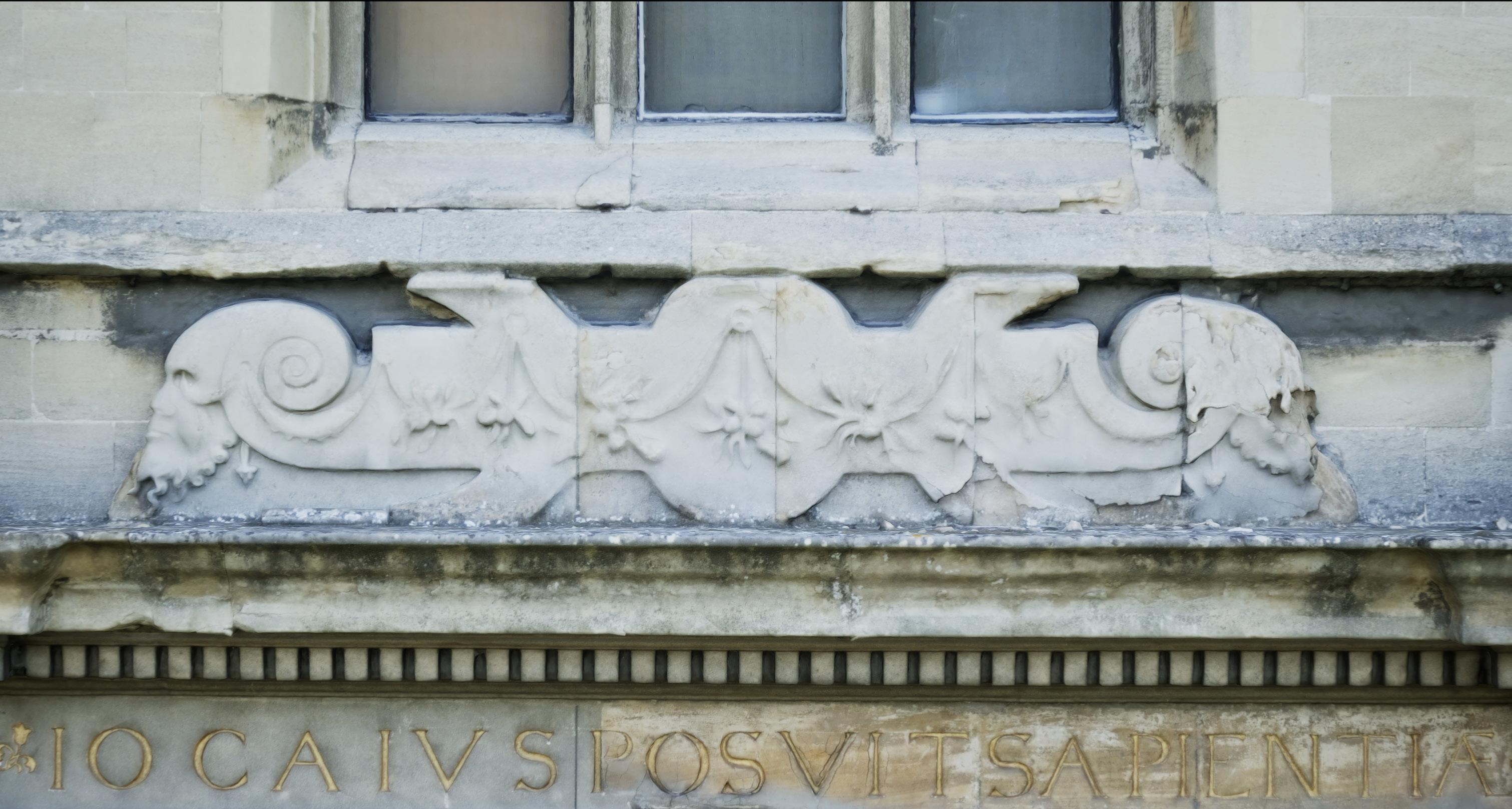 The historic decorative cartouche is a stone carving located above the Western entablature of the Gate of Virtue, which dates back to the Elizabethan period and which sits at the heart of the old courts complex at Gonville and Caius College. Due to natural weathering, the stonework of the original carving has decayed beyond repair and now needs to be replaced.