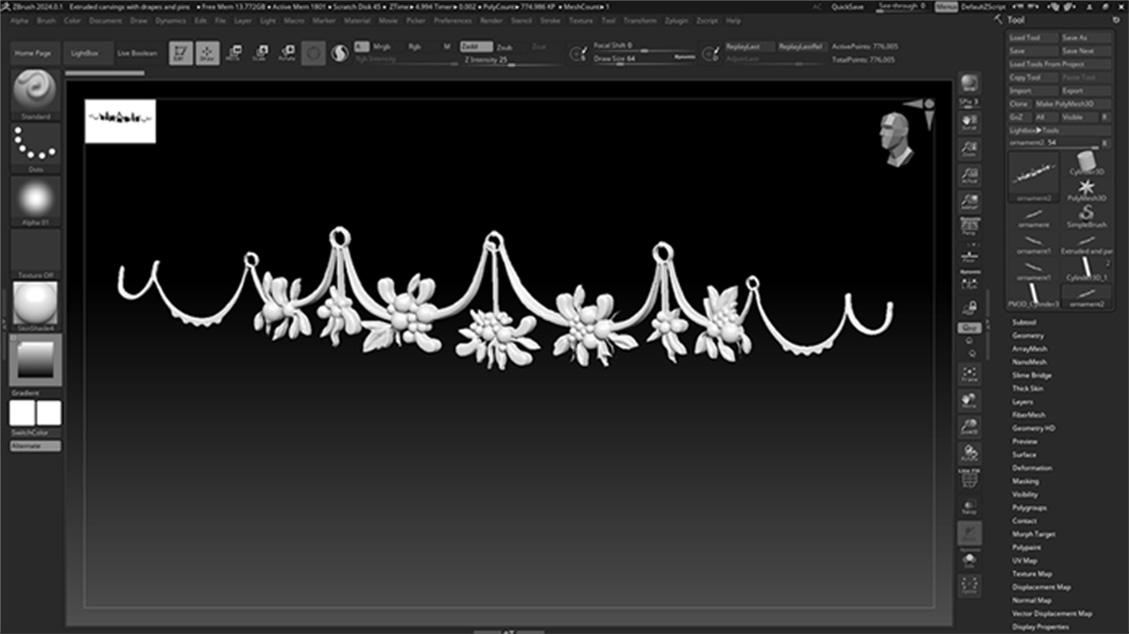 Remeshing was necessary to maintain the model’s structural integrity and ensure it could be efficiently edited in the 3D software. Each remeshing step involved simplifying or refining the mesh to balance detail with computational efficiency. After remeshing, the model was sculpted again to restore and enhance the intricate details, particularly in the most ornate and complex areas.