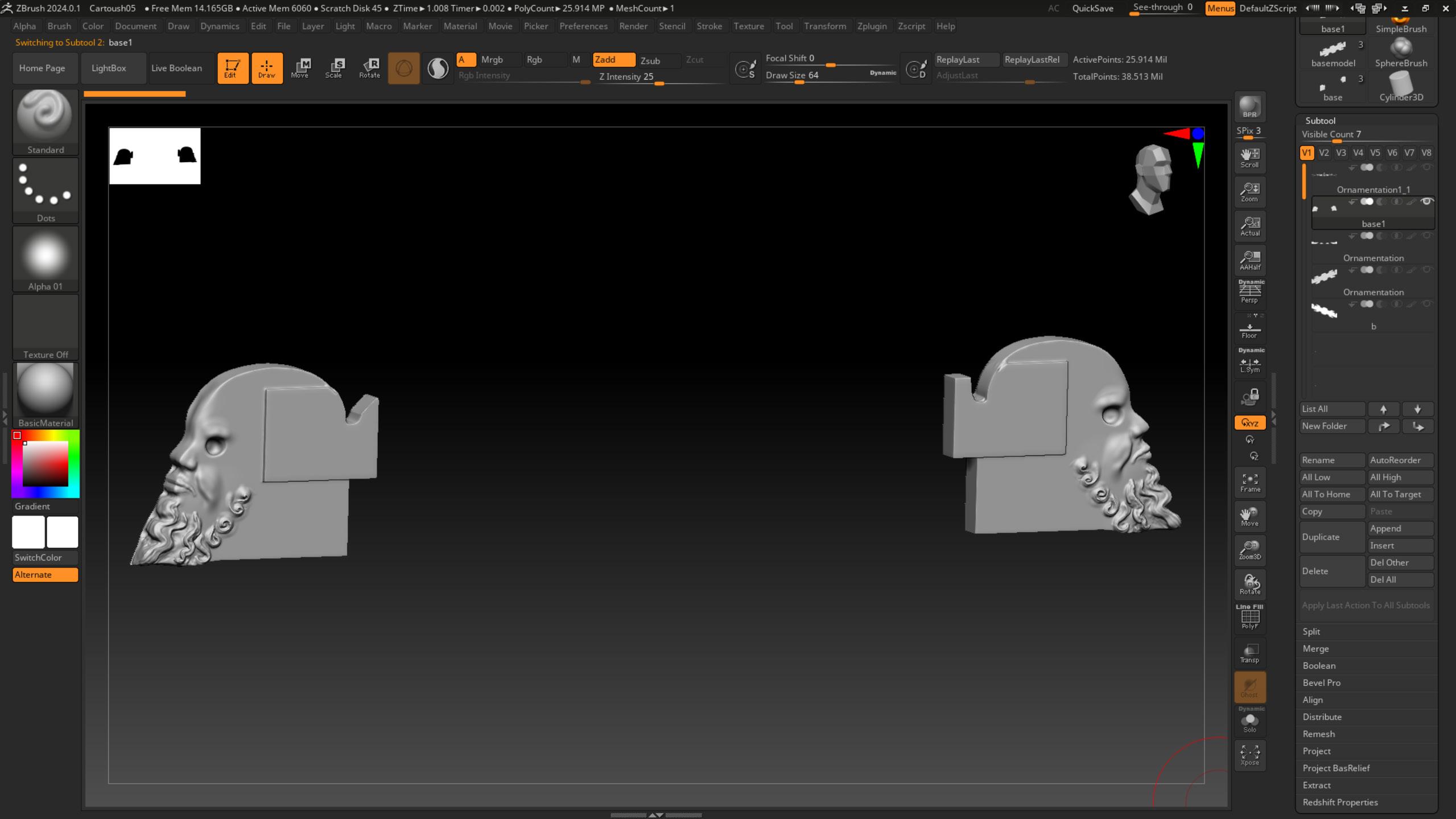 Next, the heads with the beards were meticulously sculpted. These were among the most intricate and artistically demanding parts of the cartouche, requiring careful attention to the facial features, expressions, and the texture of the beards. Achieving a lifelike and historically accurate representation involved detailed digital sculpting, which was done in ZBrush to capture the nuanced details that characterized the original stone carving.