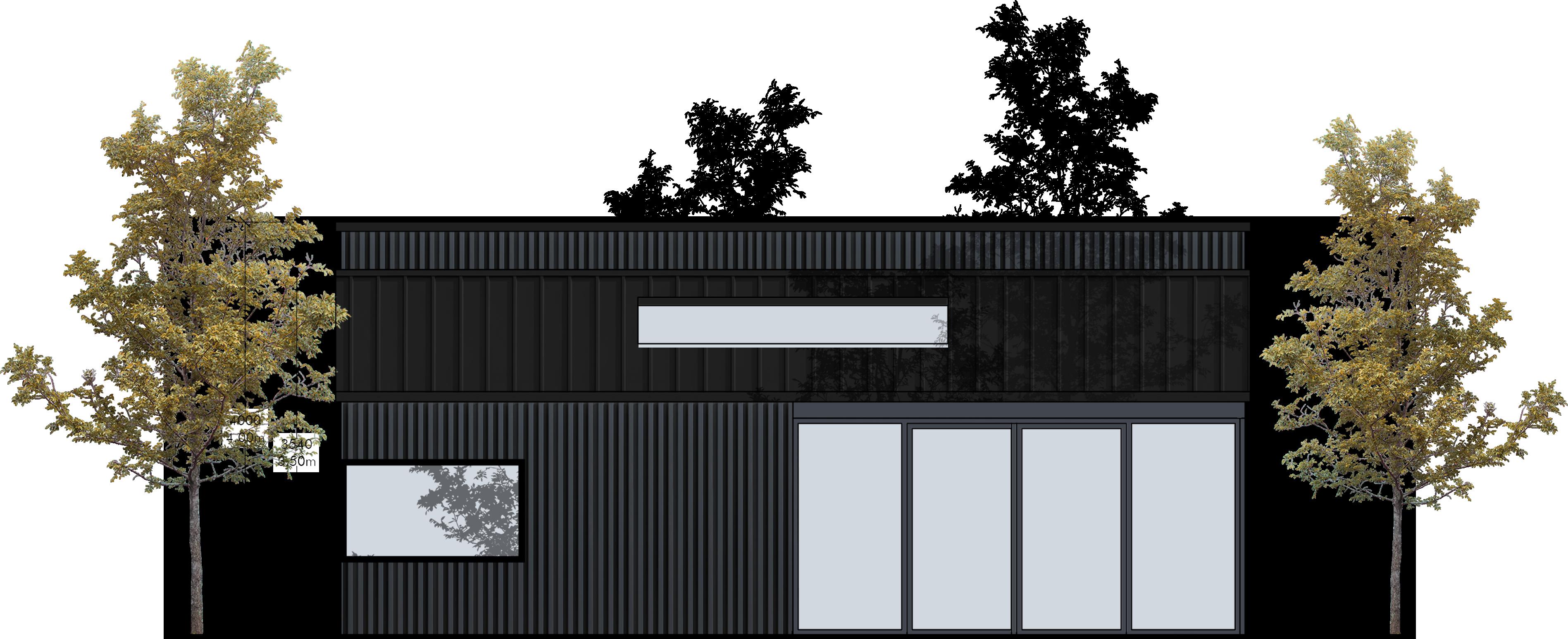 Black Steel Panels: The exterior is clad in sleek black steel panels, offering a modern and durable finish that contrasts beautifully with the lush greenery of the garden.