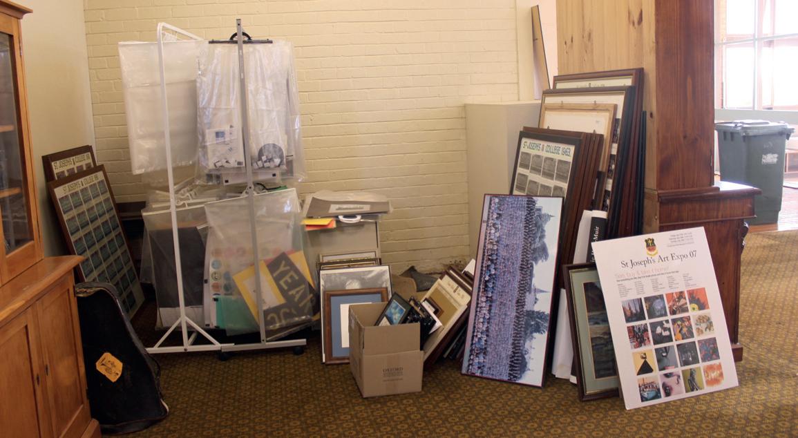 Coming into the middle of a system set up by Glen, that I knew nothing about, was difficult for me. As a result of this I decided, with the support of David Formosa and the Development team, to start a new system for organising the College archives. The space had become cluttered with a large filing unit, boxes, and large photograph frames. This clutter had marred the ambiance of the Heritage Centre. After much thought I decided to move the work desk from the archive space, to create room for the filing unit, photos and boxes. A work desk was then set up in the corner of the Heritage Centre in front of the old heater, something I have appreciated very much during the recent cold days. The archive storage room has no heating and has been extremely cold. At some point, the box gutters that run down the centre of the building had leaked, causing damage to some of the displays and files.