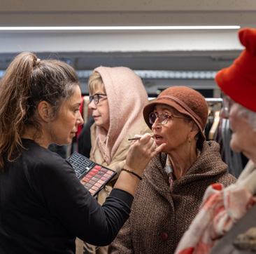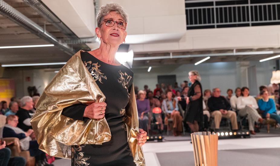 Bij het organiseren van de modeshow kwam heel wat kijken. Kringwinkel Stroom zorgde voor een prachtige selectie, vooral in gouden roodtinten, aangevuld met zwart en wit. Ingrid: “We wilden clichés doorbreken: tweedehands is stijlvol en 55plussers kunnen alles dragen wat ze willen.”